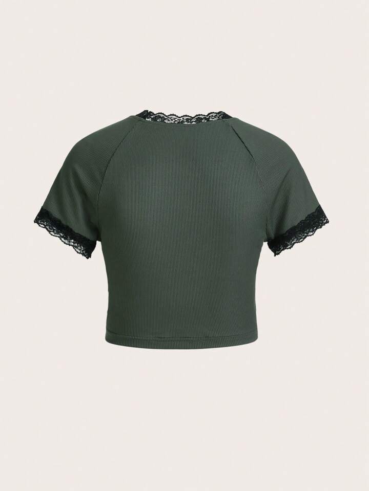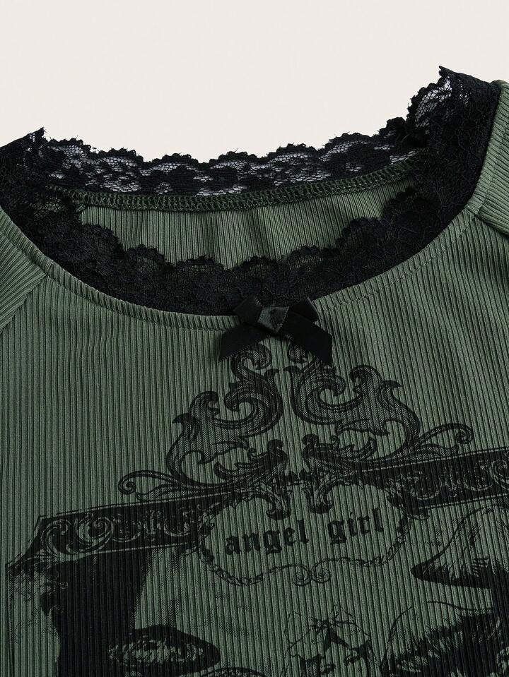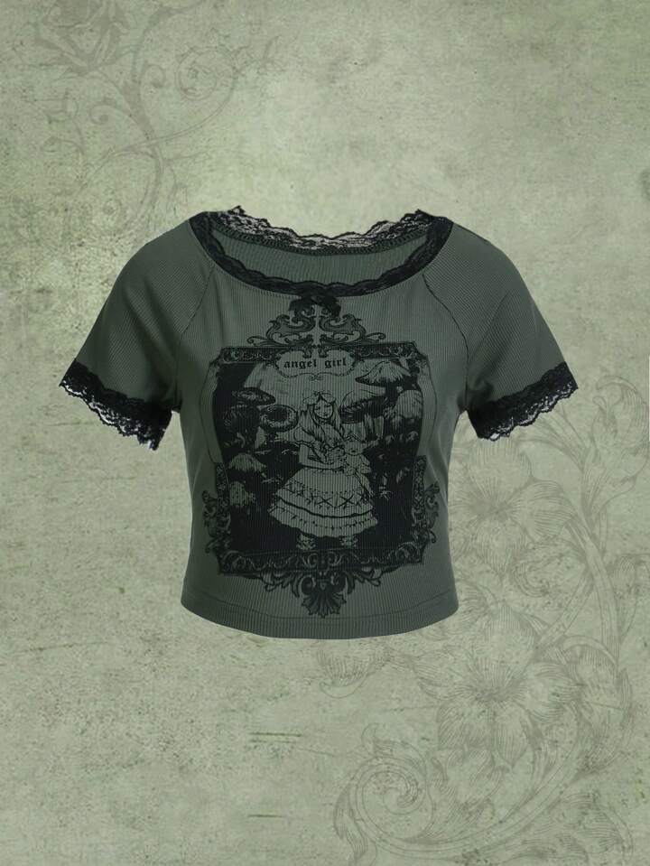 Fairycore Figure & Mushroom Print Contrast Lace Tee