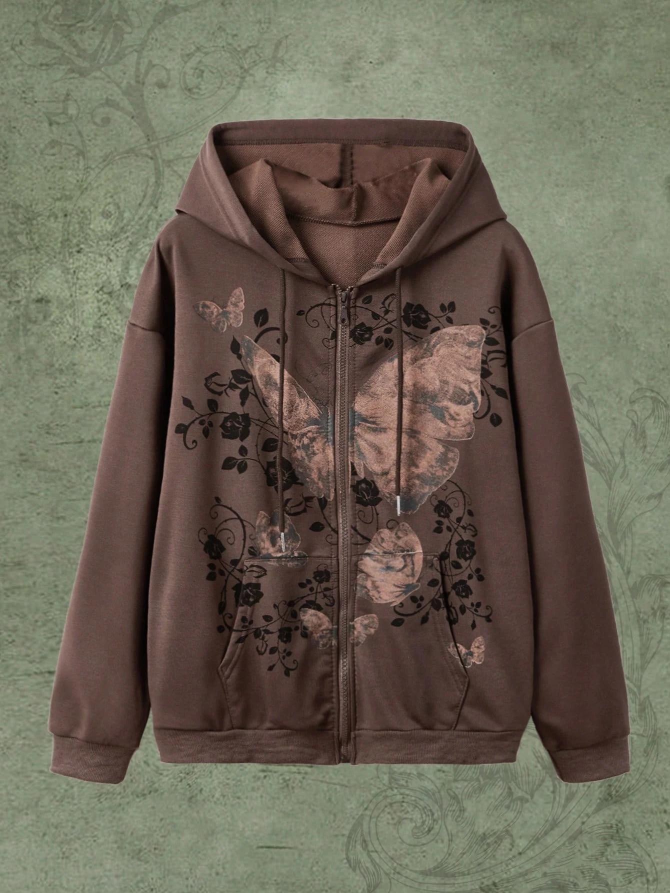 Fairycore Floral & Butterfly Graphic Zip Up Drawstring Hoodie