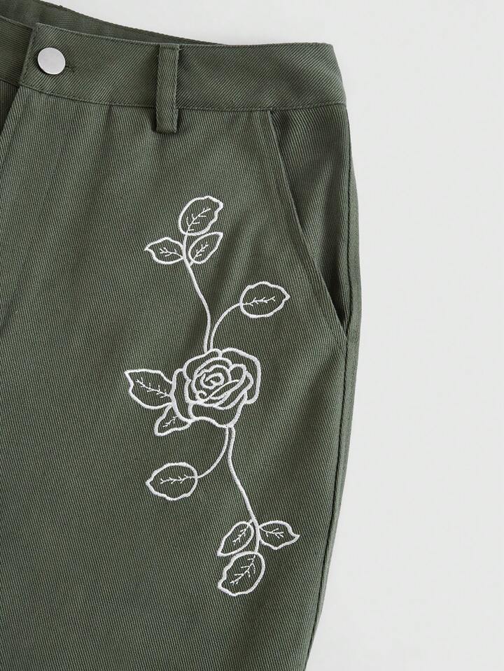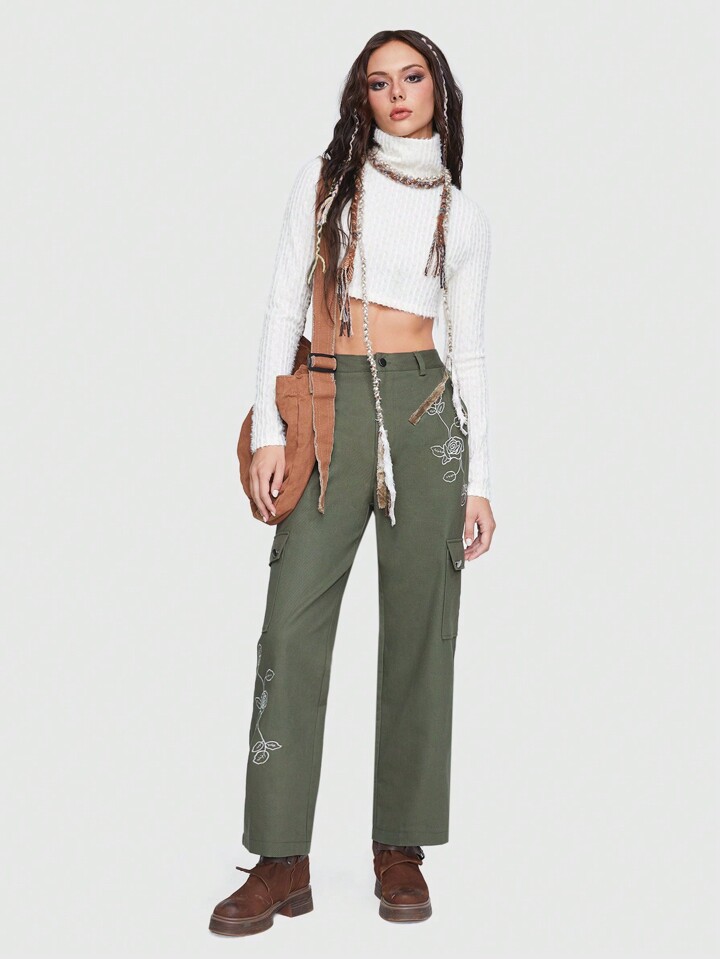 Fairycore Floral Embroidery Flap Pocket Side Cargo Pants