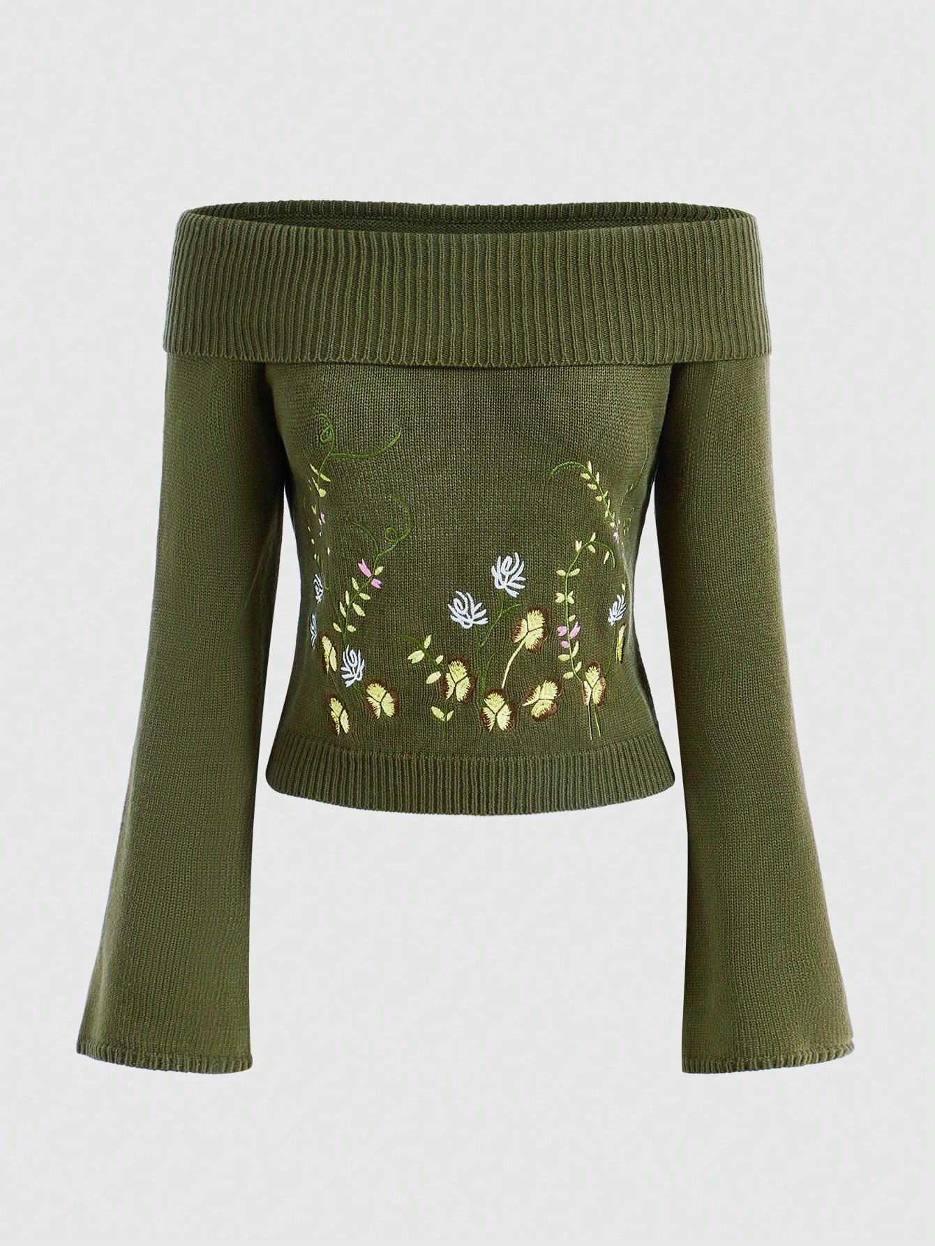 Fairycore Floral Embroidery Foldover Off Shoulder Sweater