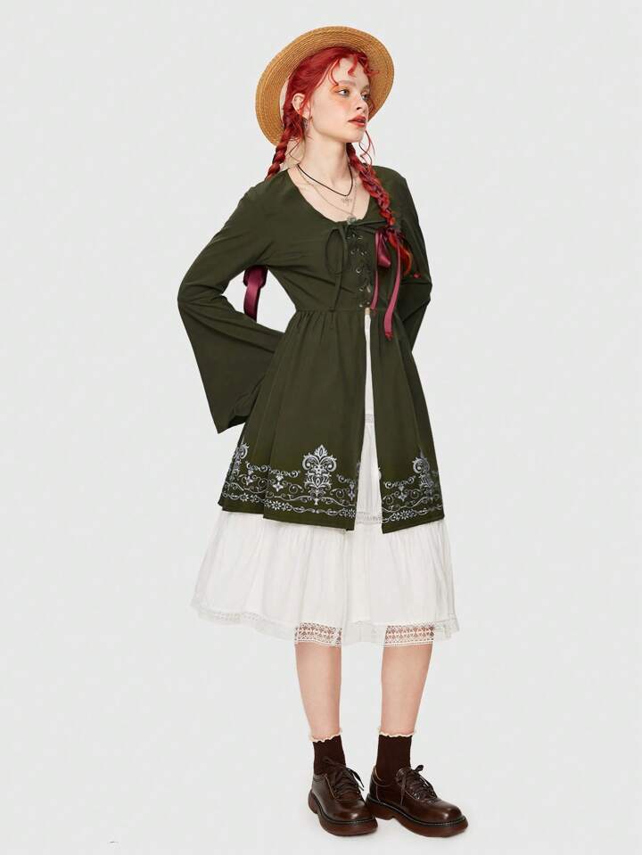 Fairycore Floral Print Flare Sleeve Lace Up Front Top