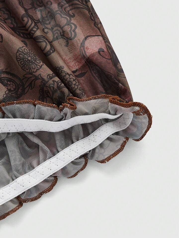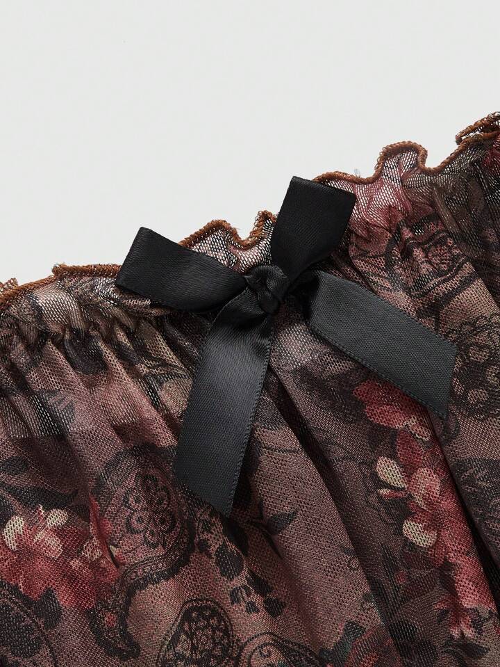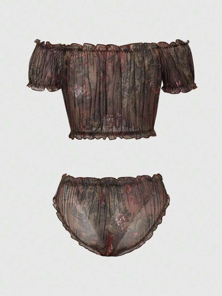Fairycore Floral Printed Ruched Off Shoulder Sexy Lingerie Set With Sheer Mesh