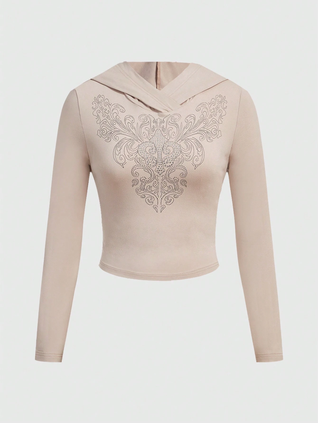 Fairycore Lily Flower Rhinestone Decor Turtleneck Tight Fit T-Shirt