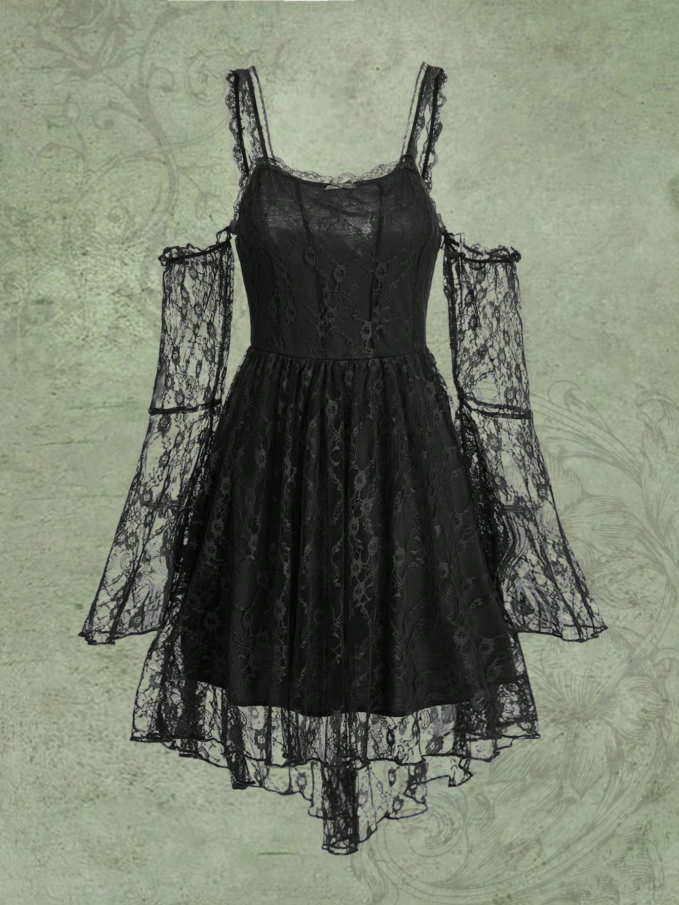 Fairycore Patchwork Lace Trim Solid Color Midi Dress
