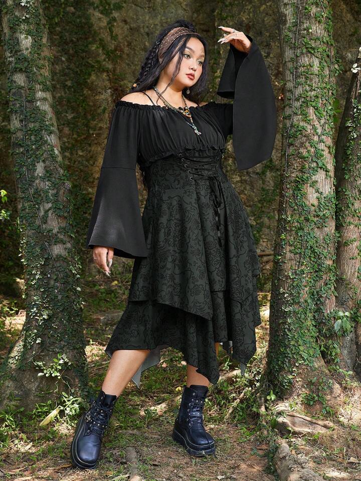 Fairycore Plus Cold Shoulder Flare Sleeve Lace Up Front Dress