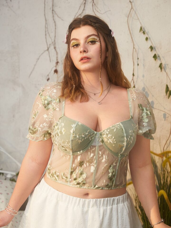Fairycore Plus Floral Embroidery Puff Sleeve Bustier Crop Lace Top