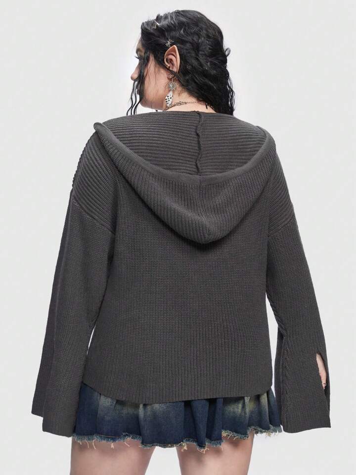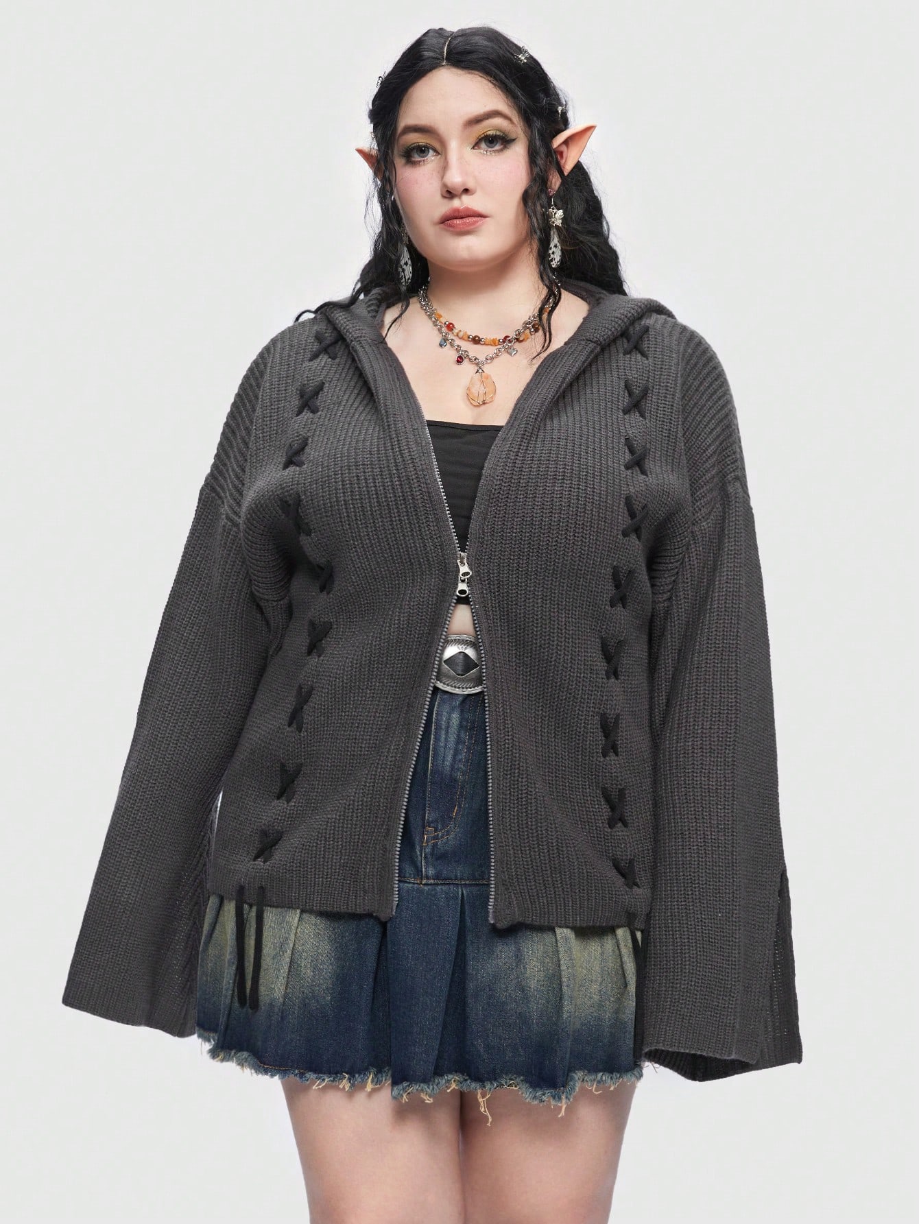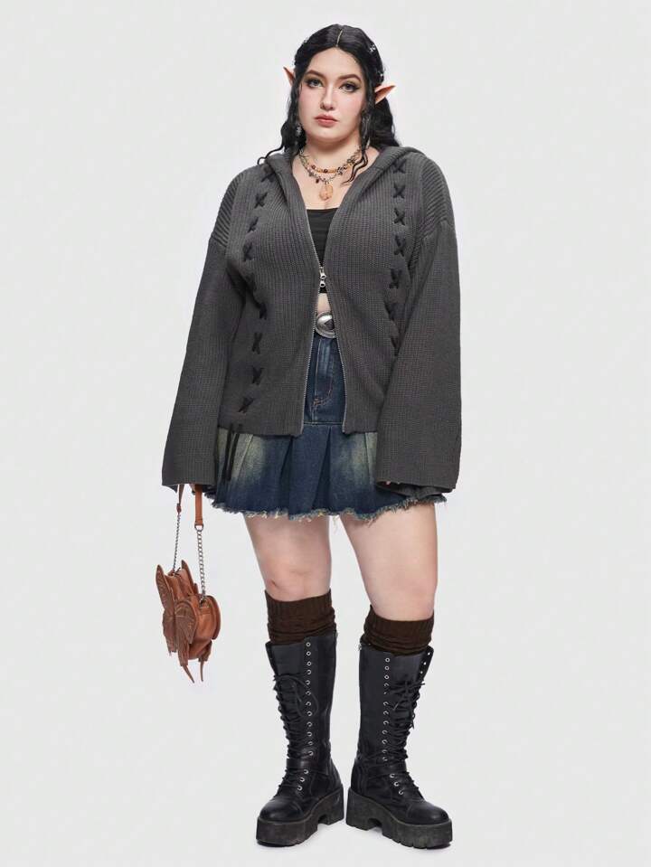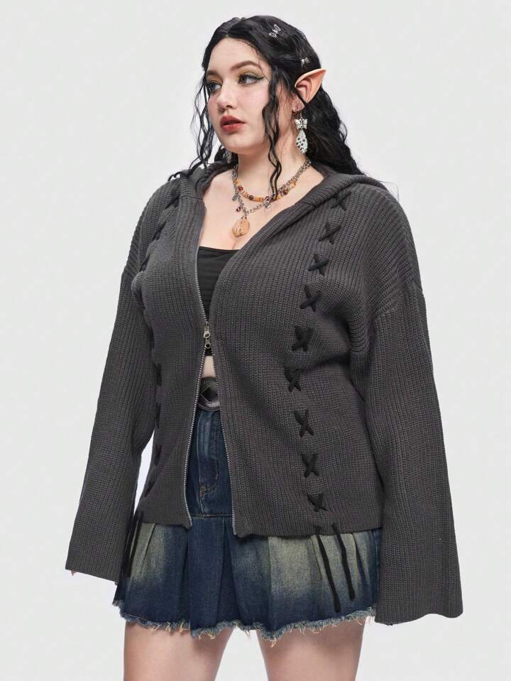 Fairycore Plus Lace Up Drop Shoulder Hooded Cardigan