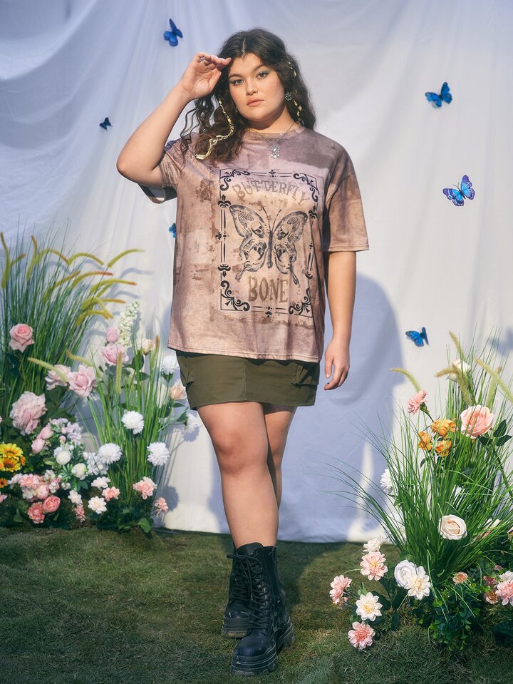 Fairycore Plus Letter Butterfly Print Drop Shoulder Tee