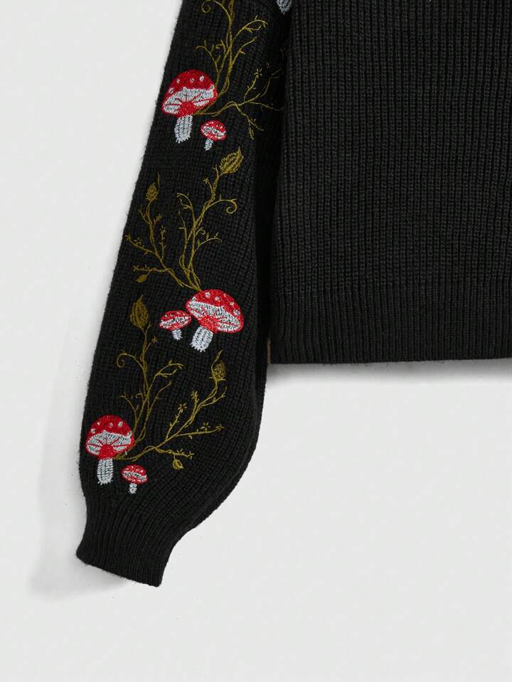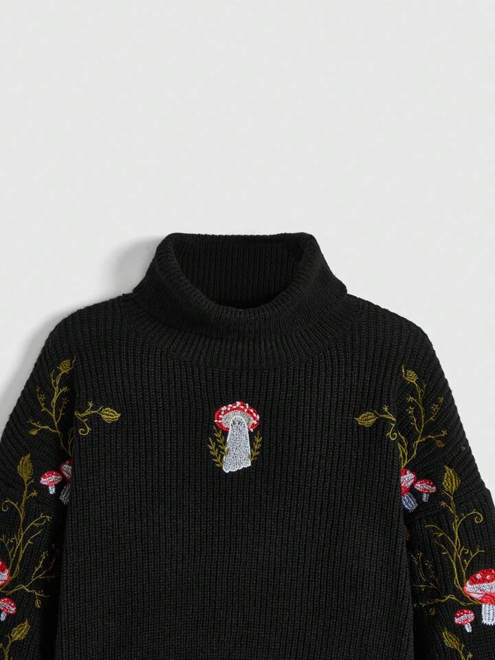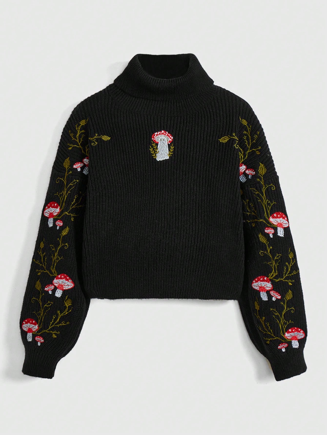 Fairycore Plus Mushroom Embroidery Turtleneck Drop Shoulder Sweater