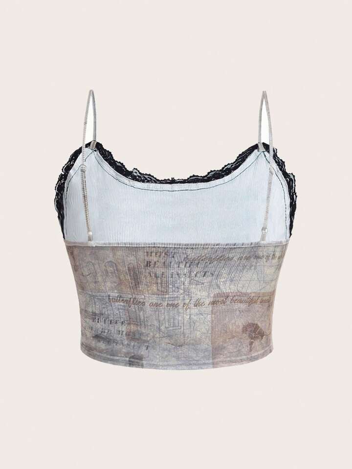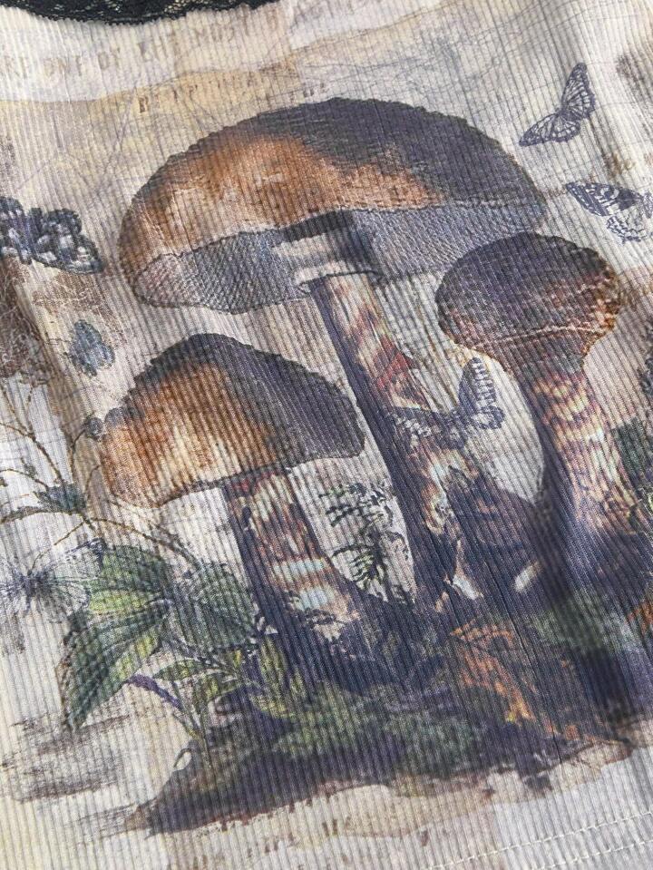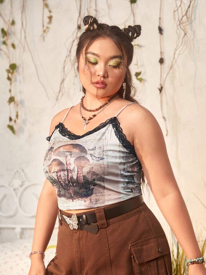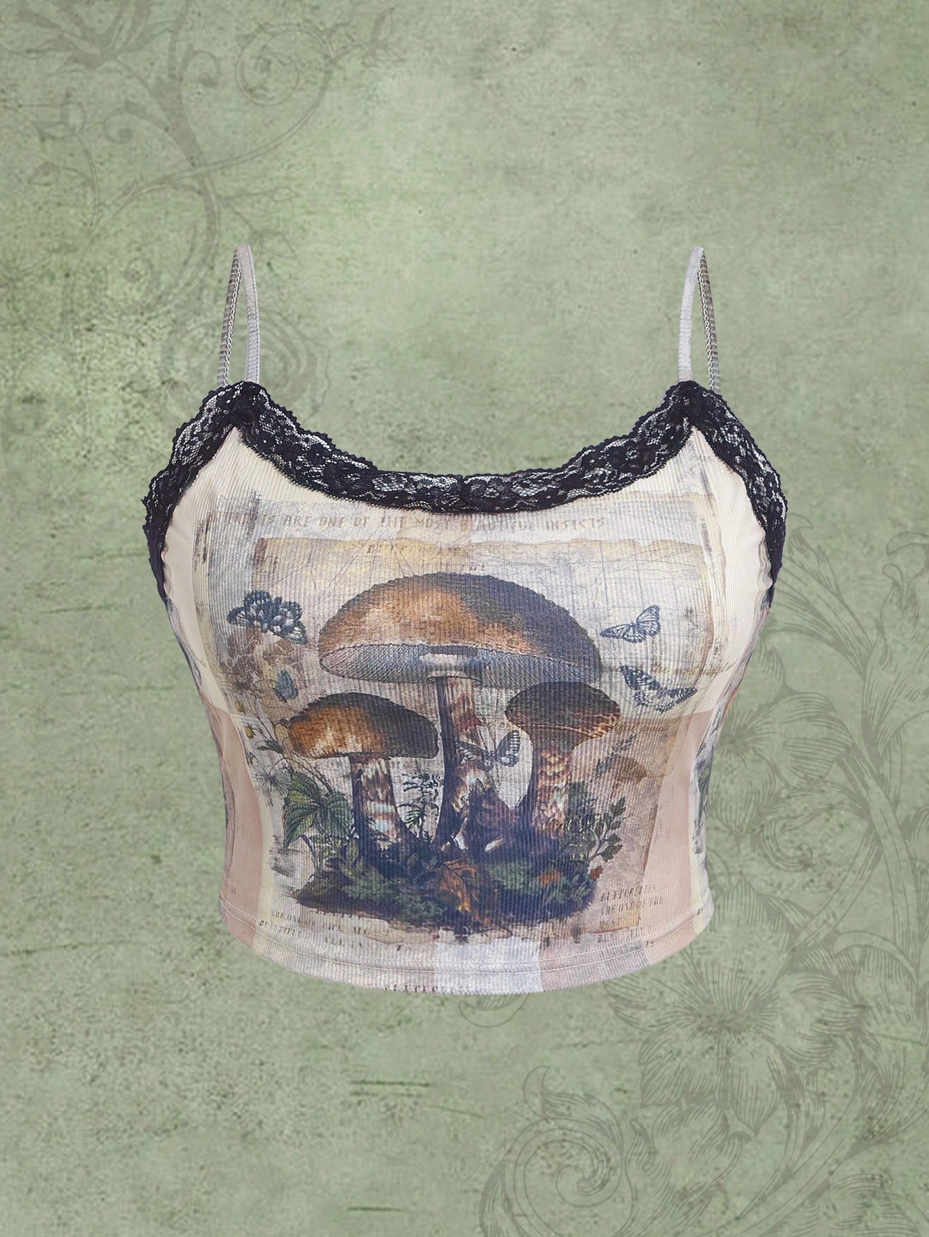 Fairycore Plus Mushroom Print Contrast Lace Cami Top