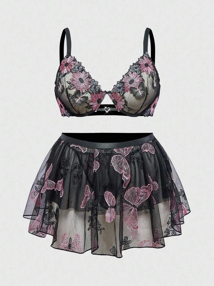 Fairycore Plus Size 3 PiecesFairy Embroidered Floral & Butterfly Lingerie Set