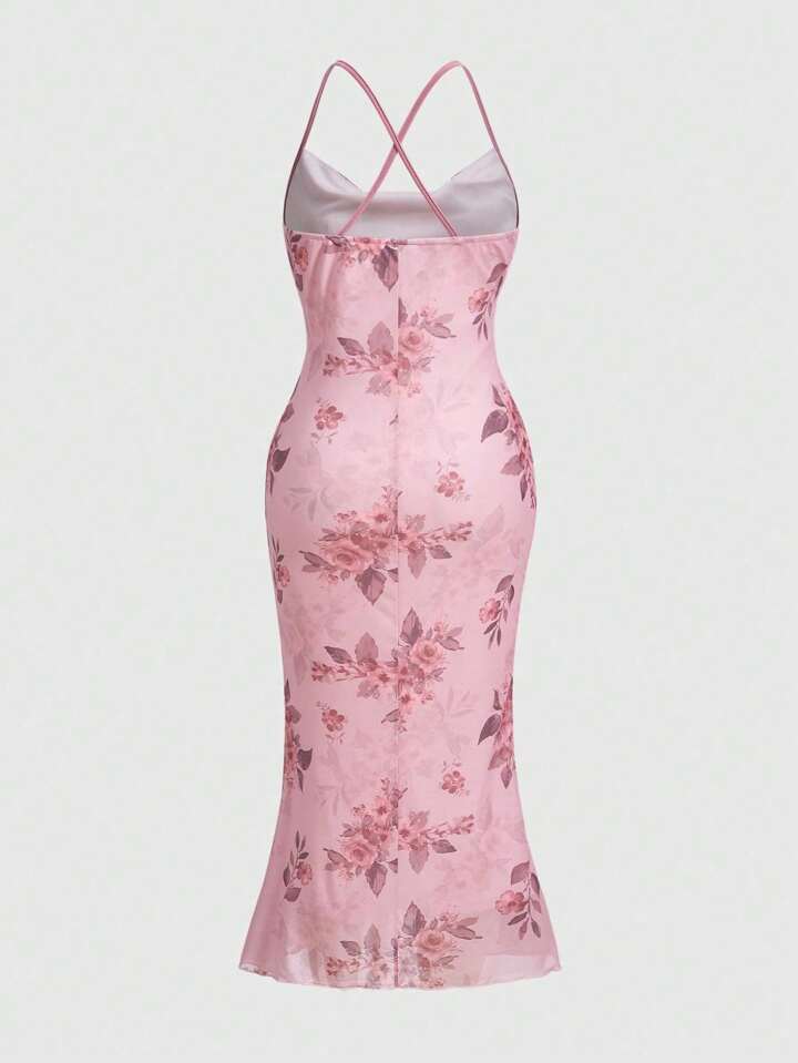 Fairycore Plus Size Floral Print Swing Fish-Tail Cami Dress For Summer Vacation