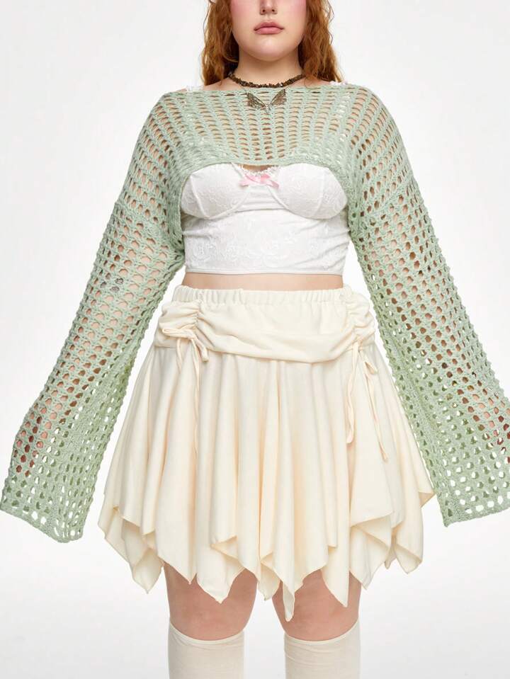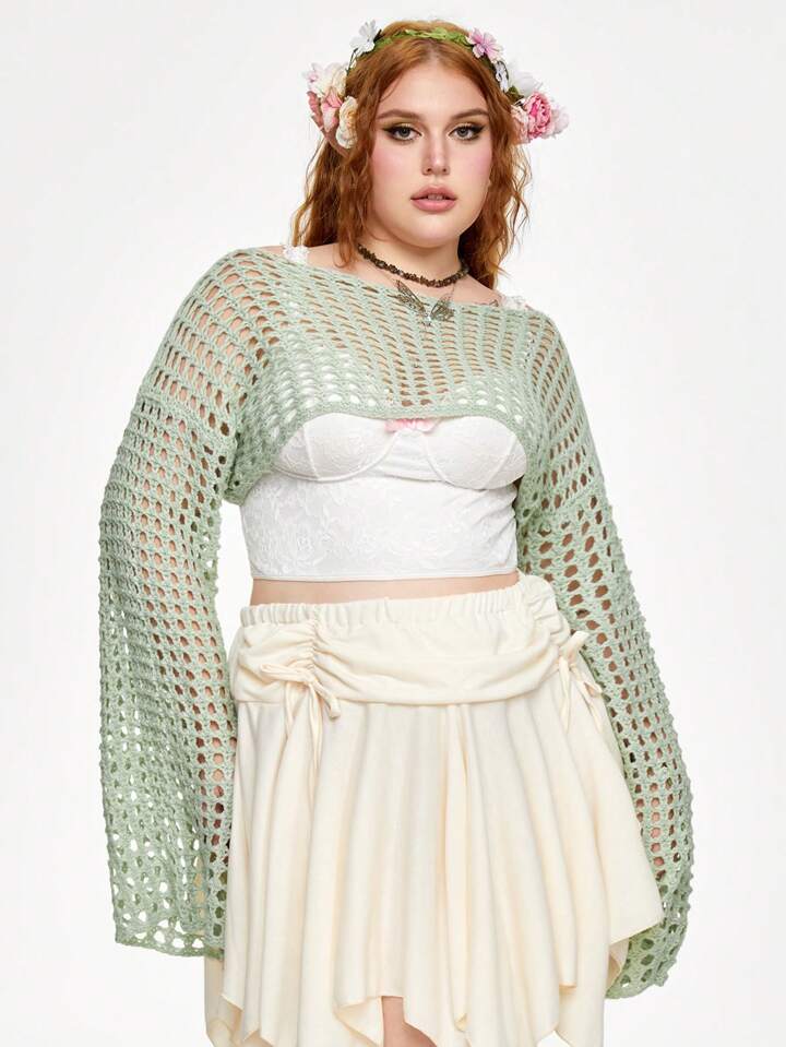 Fairycore Plus Size Summer Fashion Light Green Hollow Knit Flare Sleeve Cropped Sweater