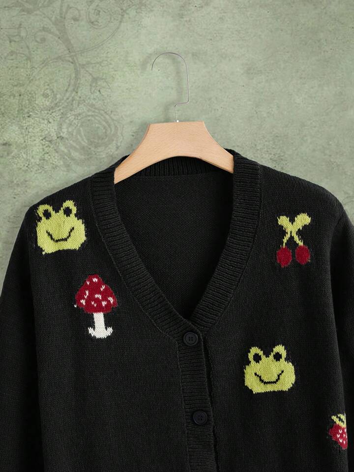Fairycore Plus Size Women's Frog & Mushroom Pattern Cardigan