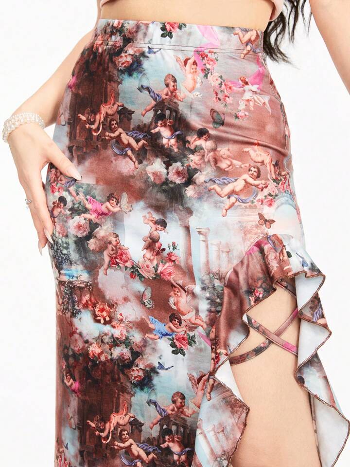 Fairycore Renaissance Vintage Angel & Flower Printed Hem Split Ruffle Skirt