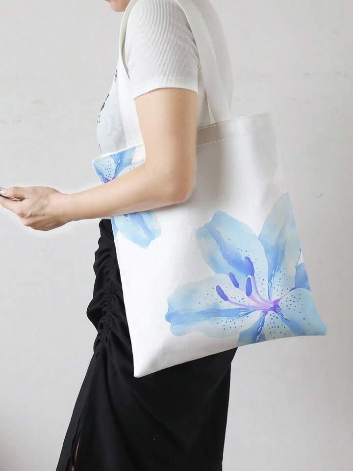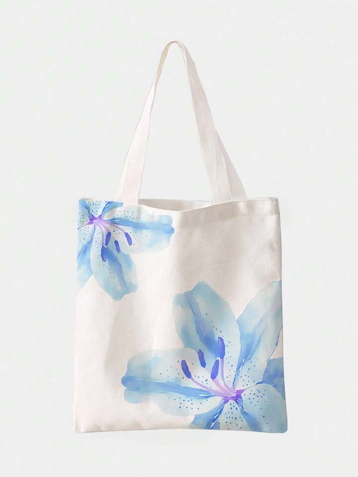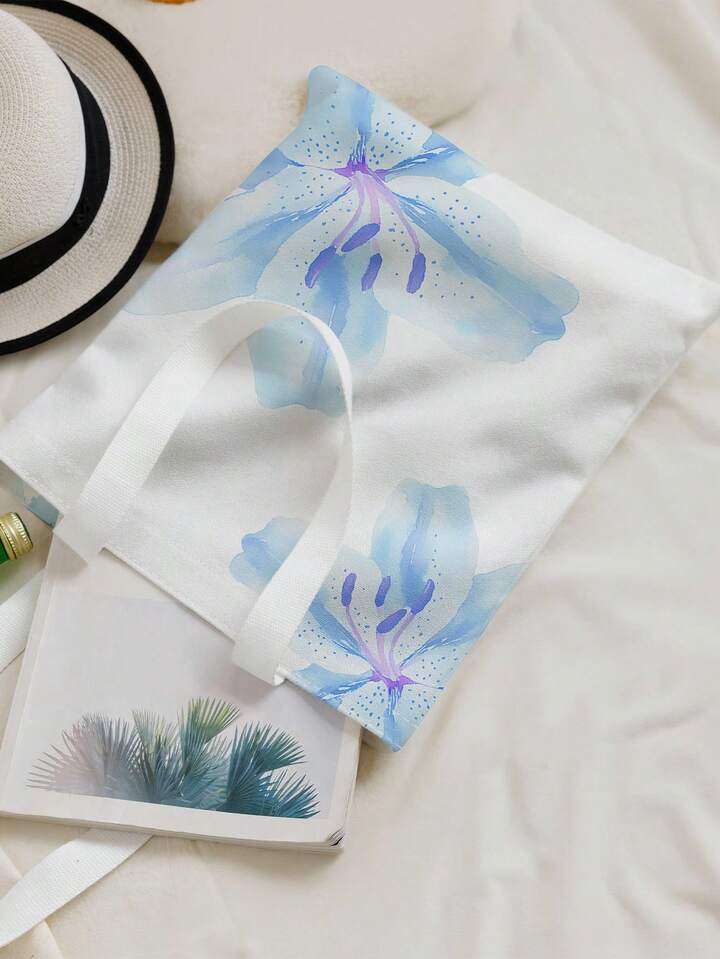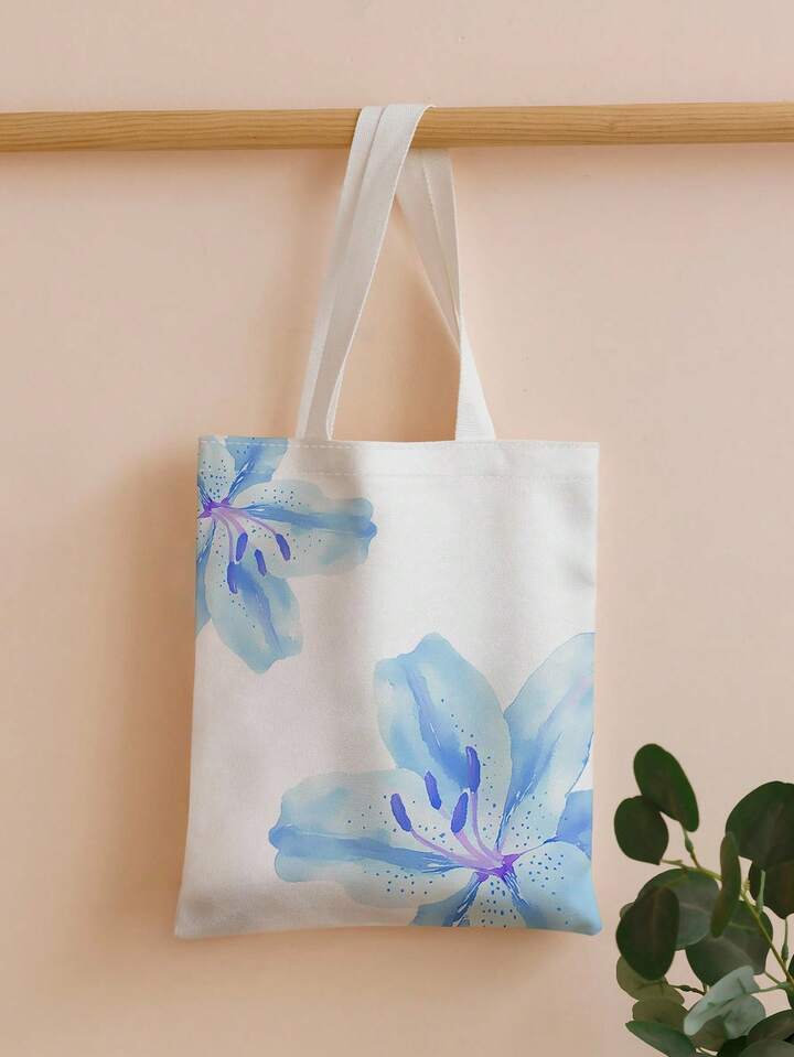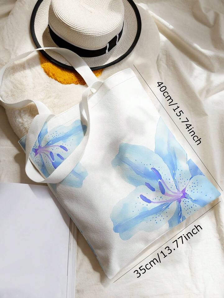 Fairycore Reusable Blue Lily Printed Canvas Shopping Bag & Shoulder Bag, Suitable For Shopping