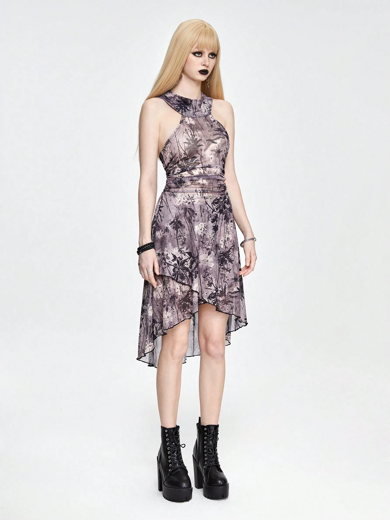 Fairycore Subculture Net Yarn Printing Backless Halter Vacation Style Women's Dress