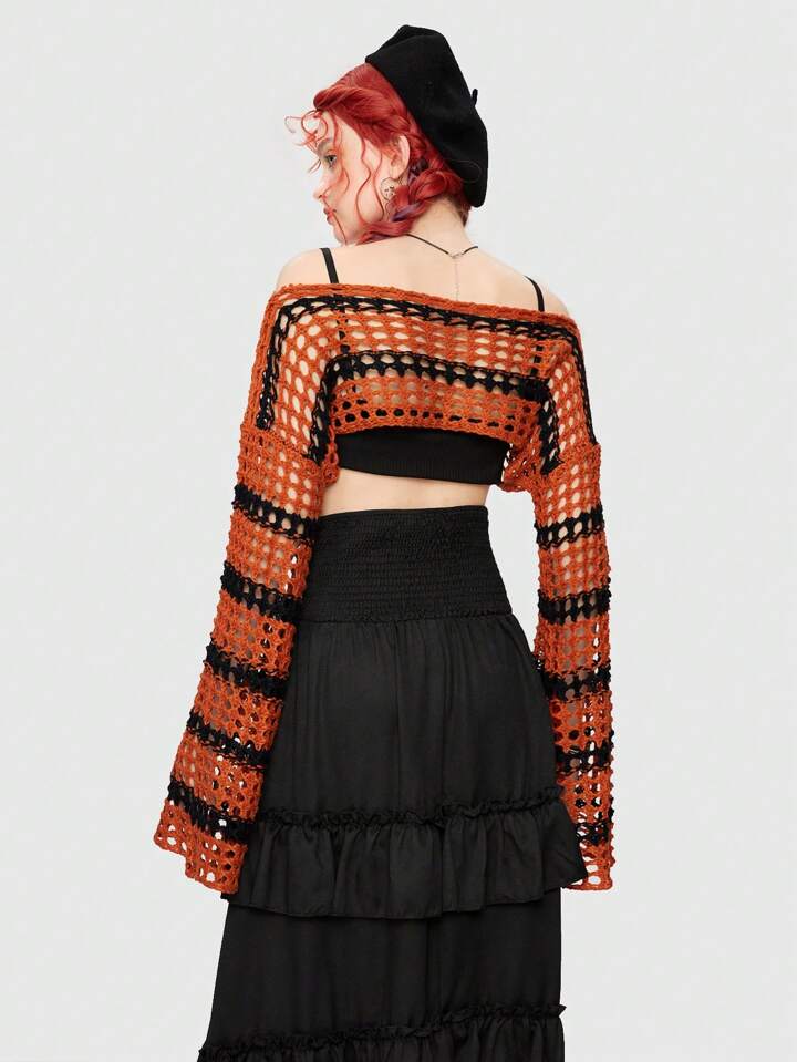 Fairycore Summer Crochet Stripe Pattern Bell Sleeve Sweater