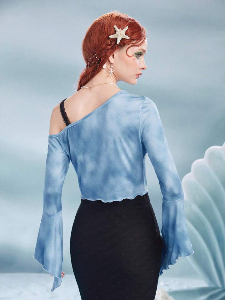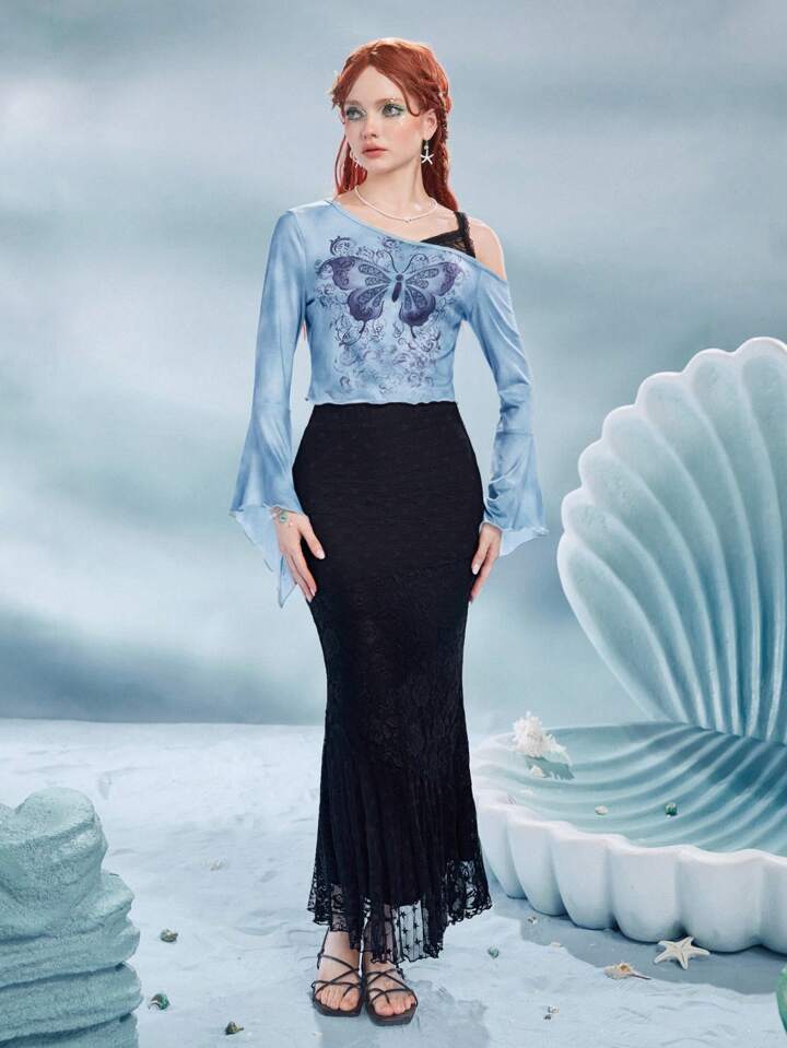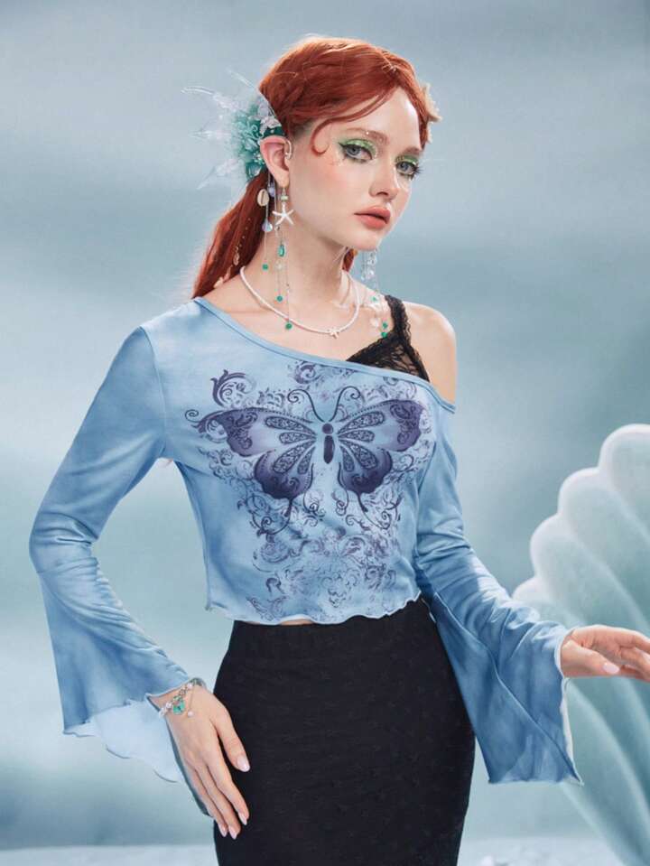 Fairycore Vacation Style Butterfly Print Long Sleeve Fashion Oblique Shoulder 2 In 1 T-Shirt