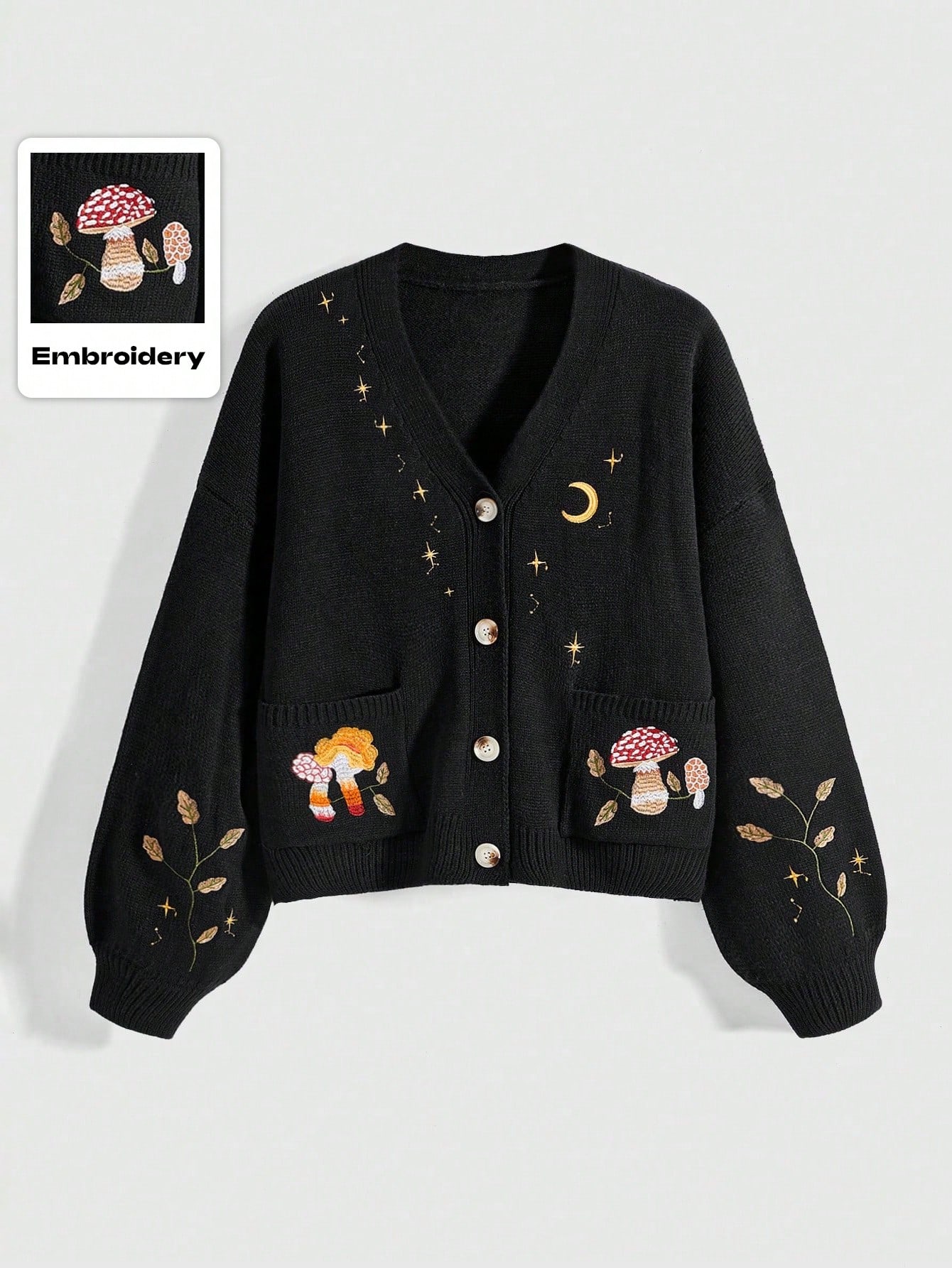 Fairycore Vintage Mushroom, Star, Moon Embroidered Plus Size Women Sweater Cardigan With Puff Sleeves/Winter