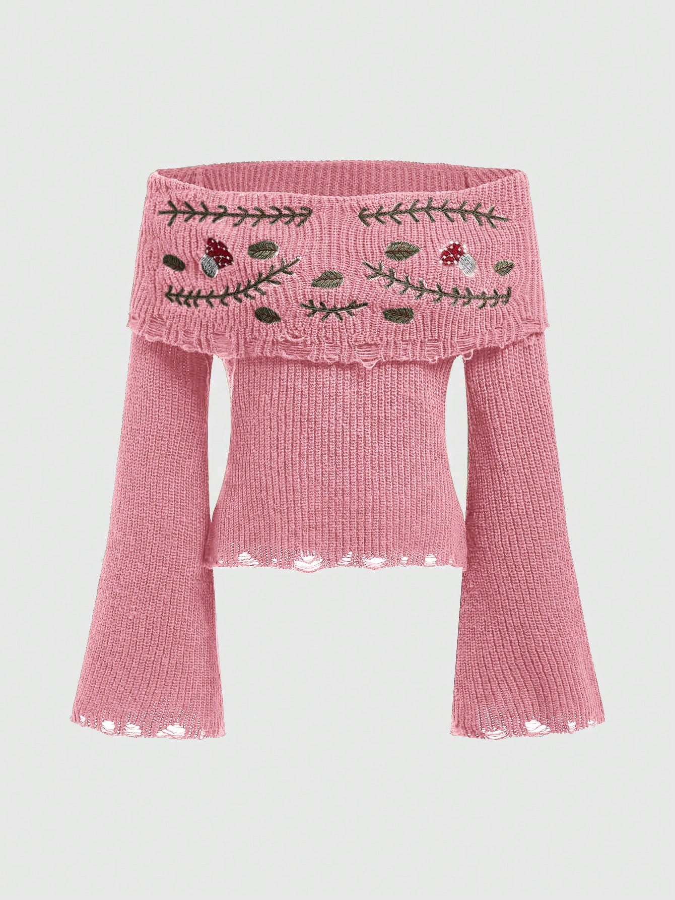 Fairycore Women Distressed Mushroom Embroidery Off-Shoulder Sweater