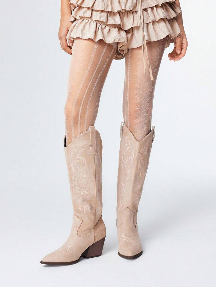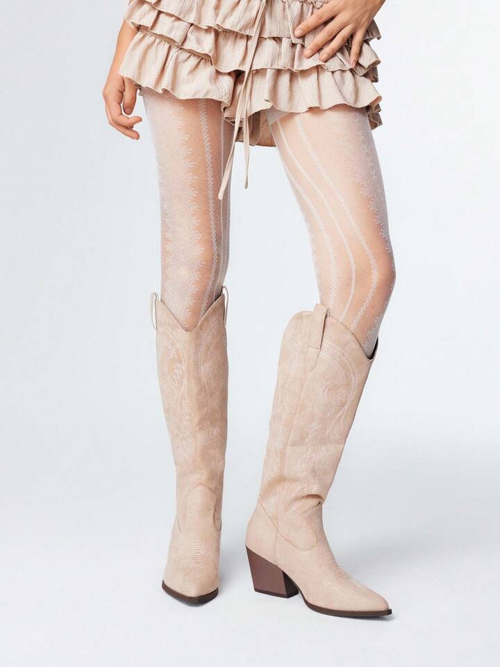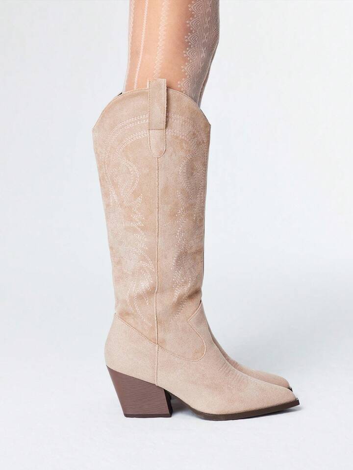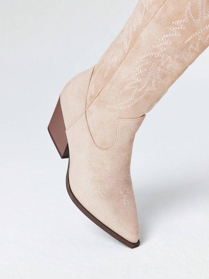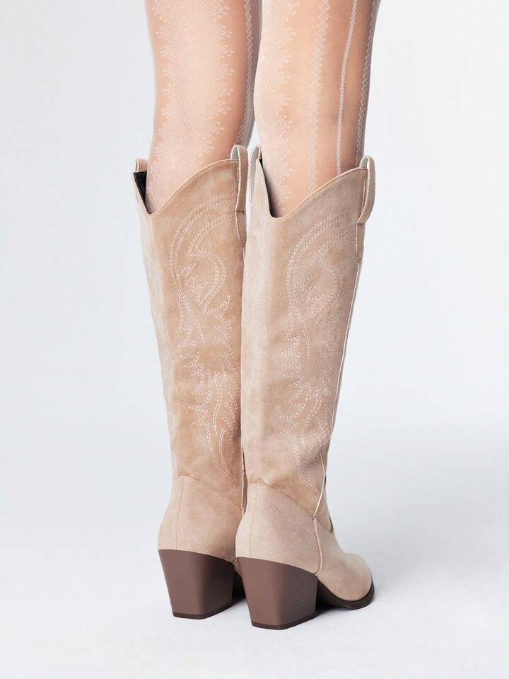 Fairycore Women's Autumn/Winter New Pointed Toe Chunky Heel Embroidered Ankle Boots, Suede Outdoor Fashion Slip-On Western Cowboy Boots