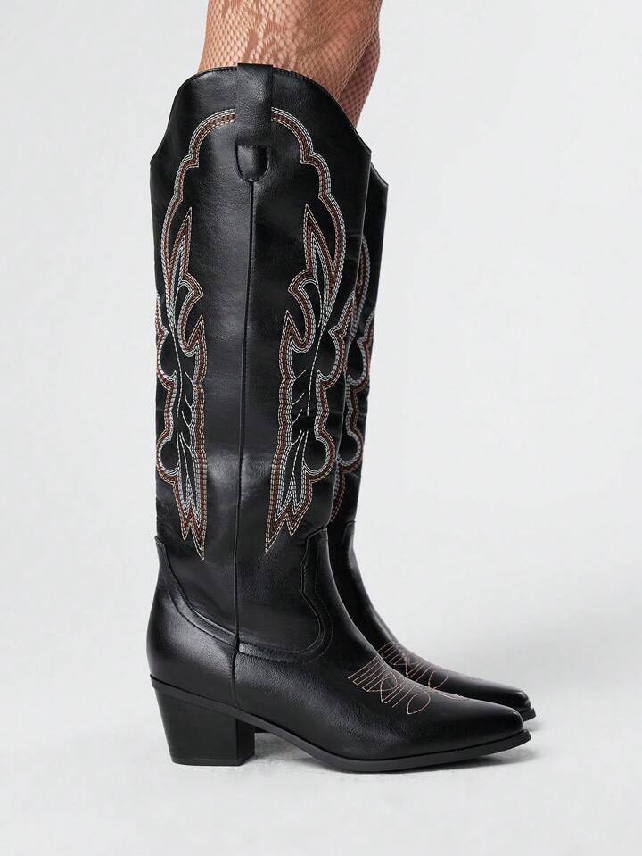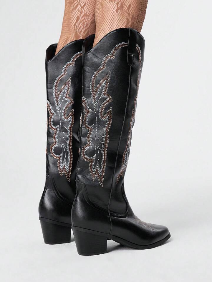 Fairycore Women's Black Embroidered Western-Style Slip-On Over-The-Knee Boots, Fashion Leather Boots For Spring And Autumn