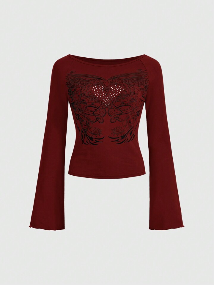 Fairycore Women's Bling Rhinestone Wing Pattern Bell Sleeve T-shirt
