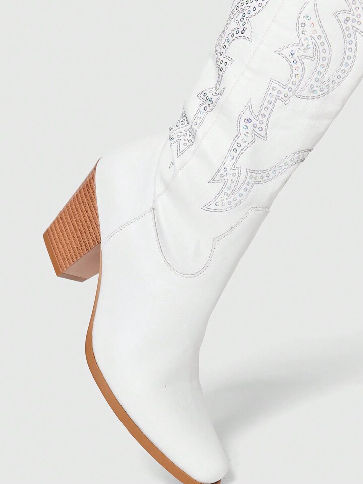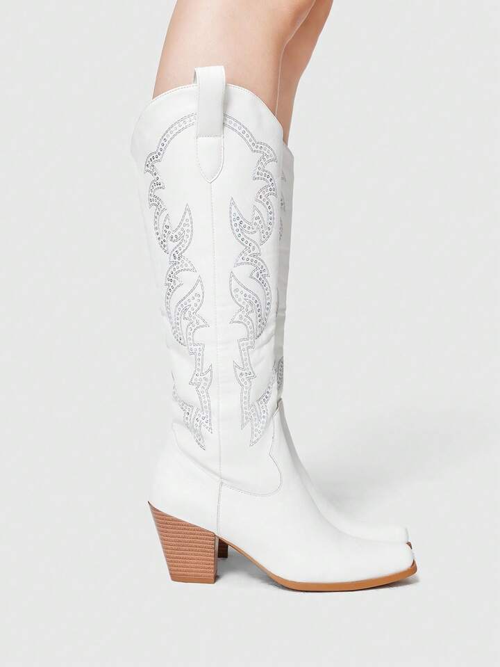 Fairycore Women's Pointed Toe Glitter Embroidered Western Cowgirl Boots, Outdoor Fashion Patent Leather Knee-High Boots, Spring/Autumn New Arrival