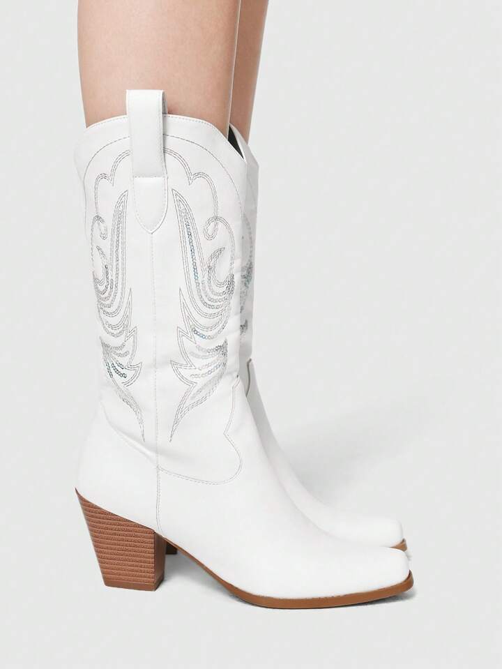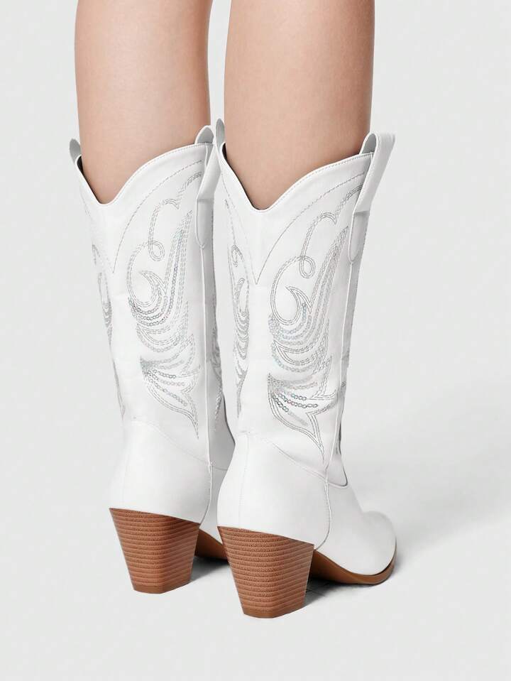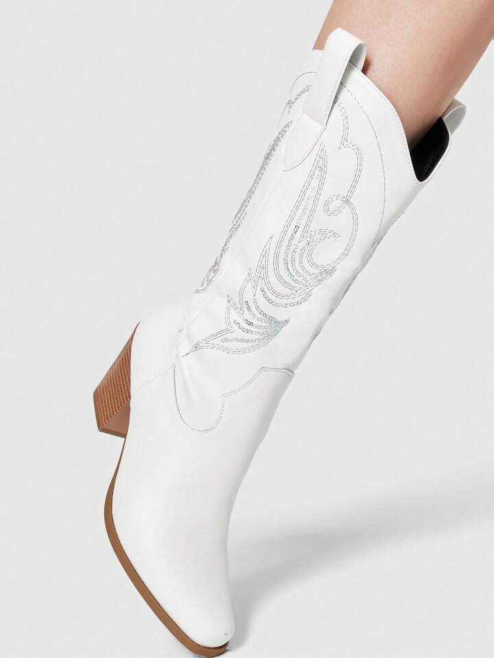 Fairycore Women's Square Toe Chunky Heel Western Embroidered Boots, Slip On Design, Leather Upper, Mid-Calf, Spring/Autumn New Outdoor Fashion