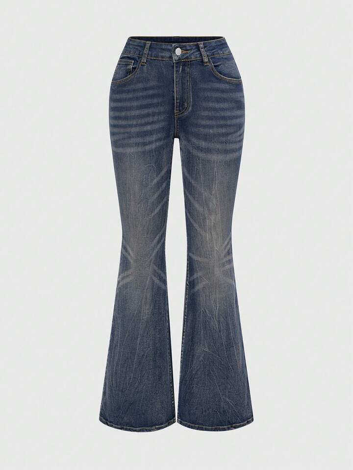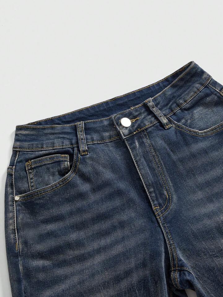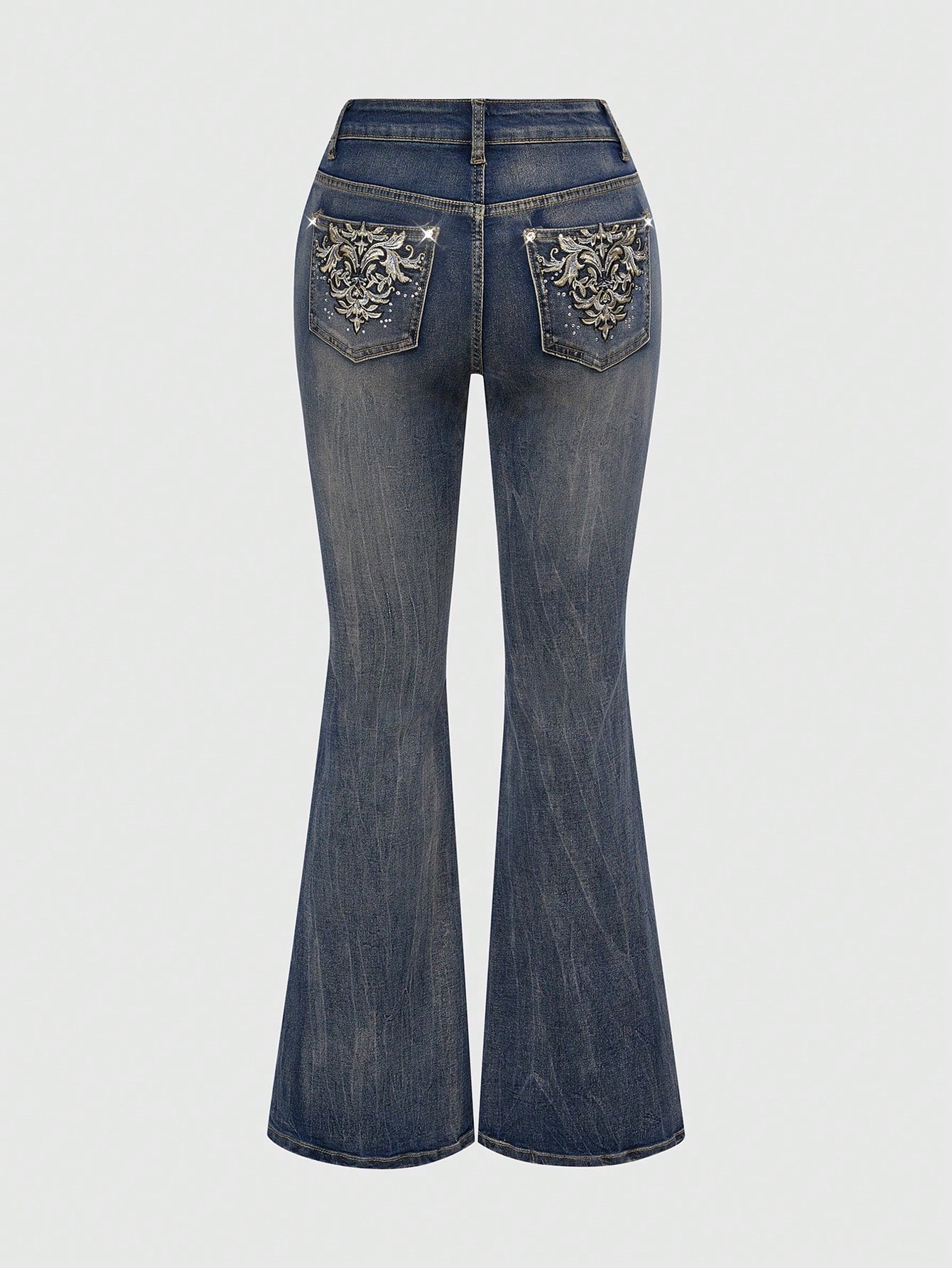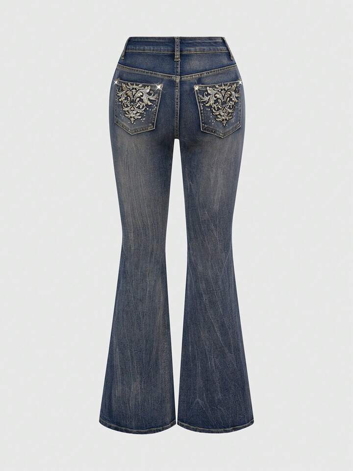 Fairycore Y2K Sexy Distressed Flare Jeans With Rear Pockets, Vine Embroidery & Rhinestones