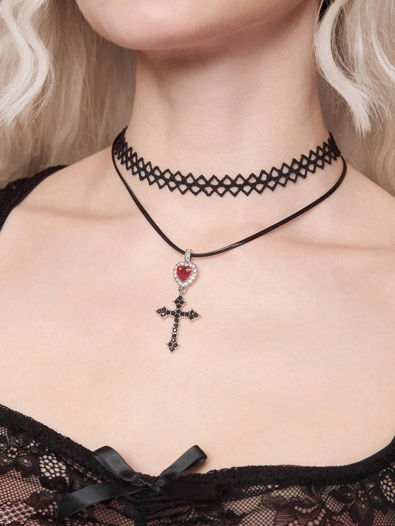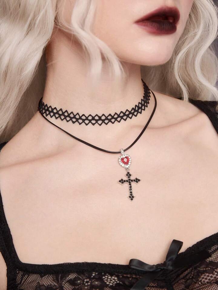 Fashionable Dark Gothic Lace Heart & Cross Choker Necklace
