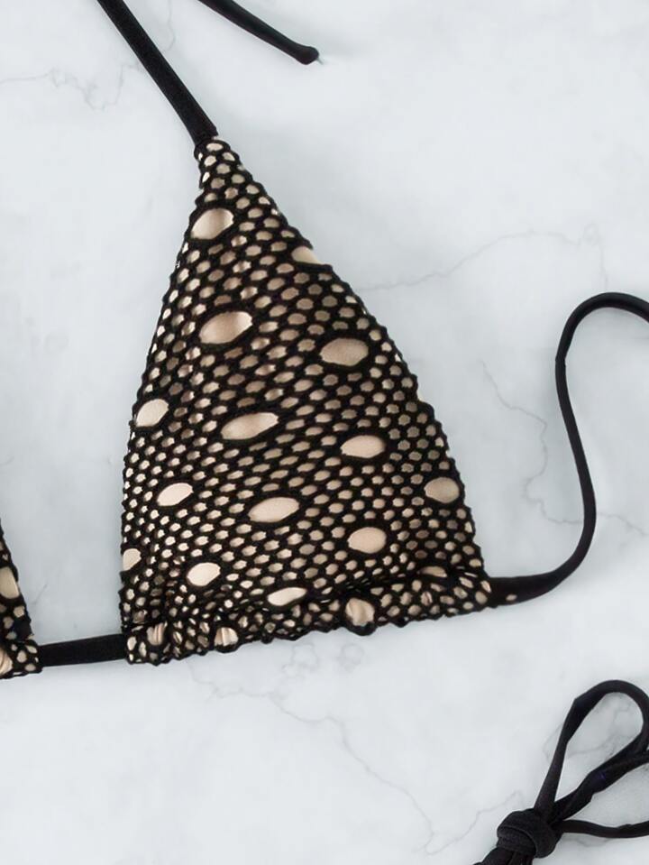Fishnet Overlay Halter Micro Bra Tie Side Summer Beach Bikini Set