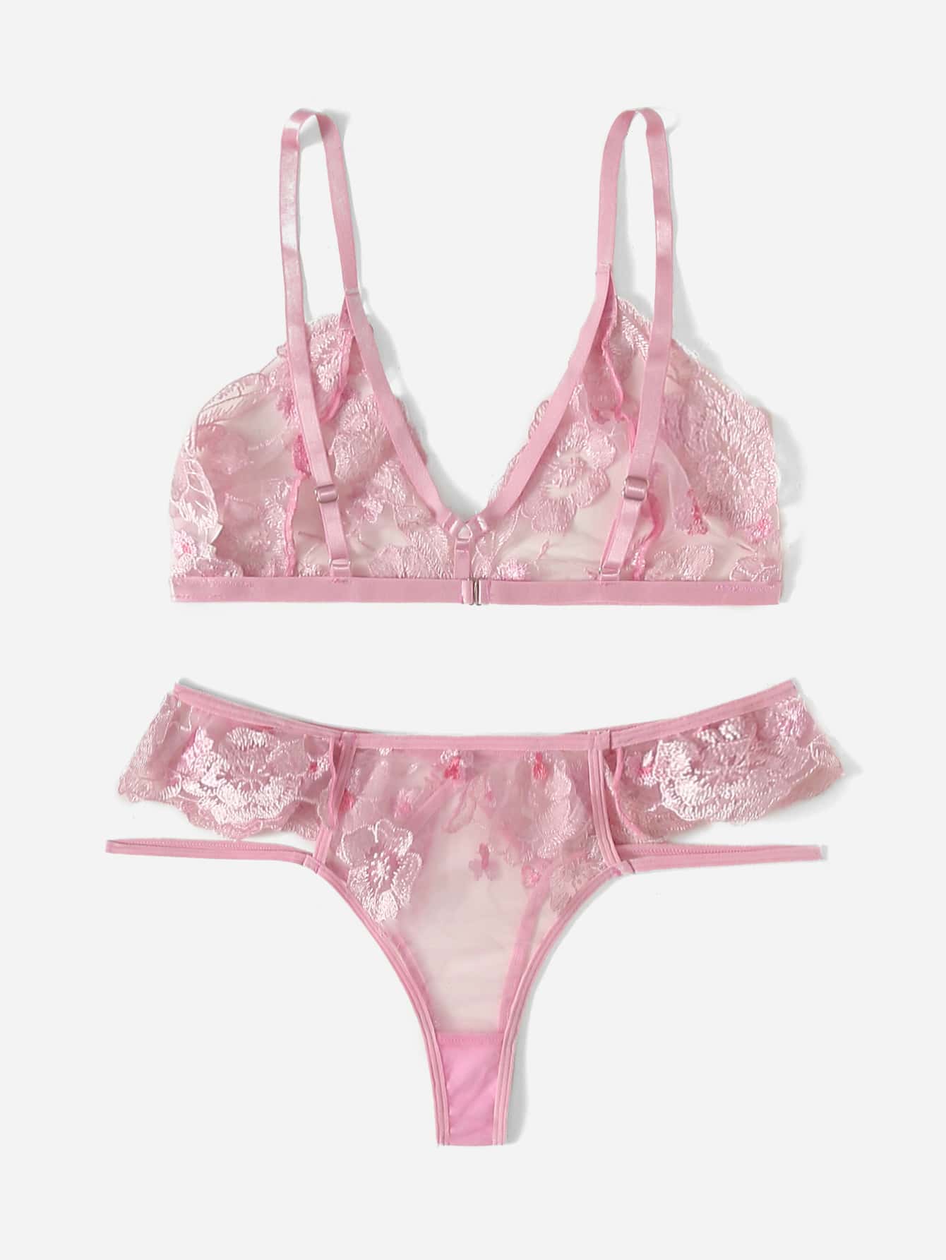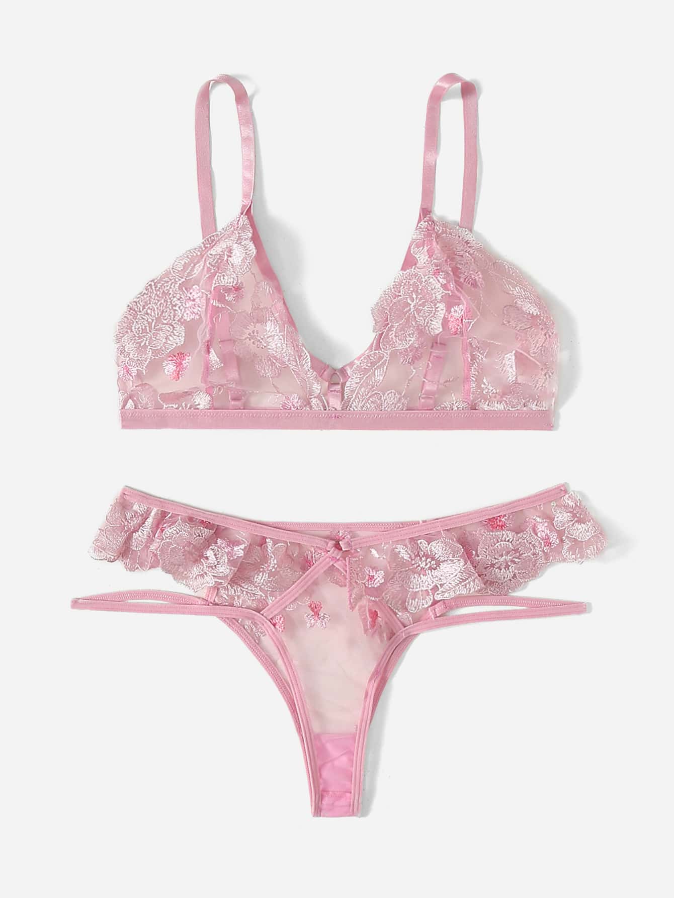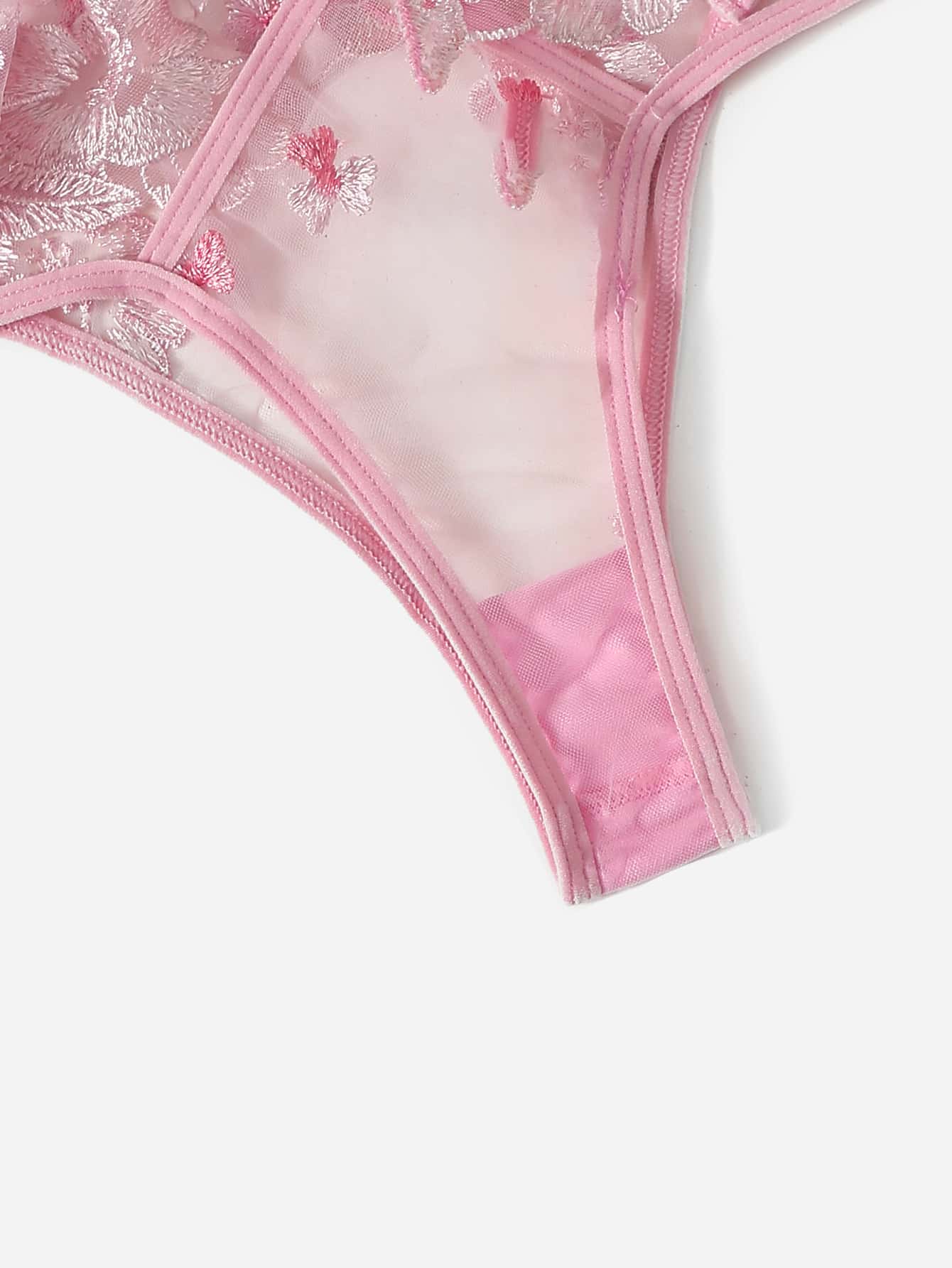 Floral Embroidered Mesh Cut Out Lingerie Set