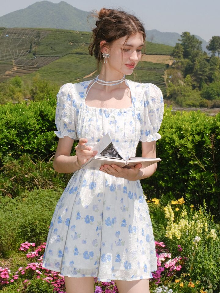 Floral Print Ruched Bust Puff Sleeve Dress Cottagecore Dress