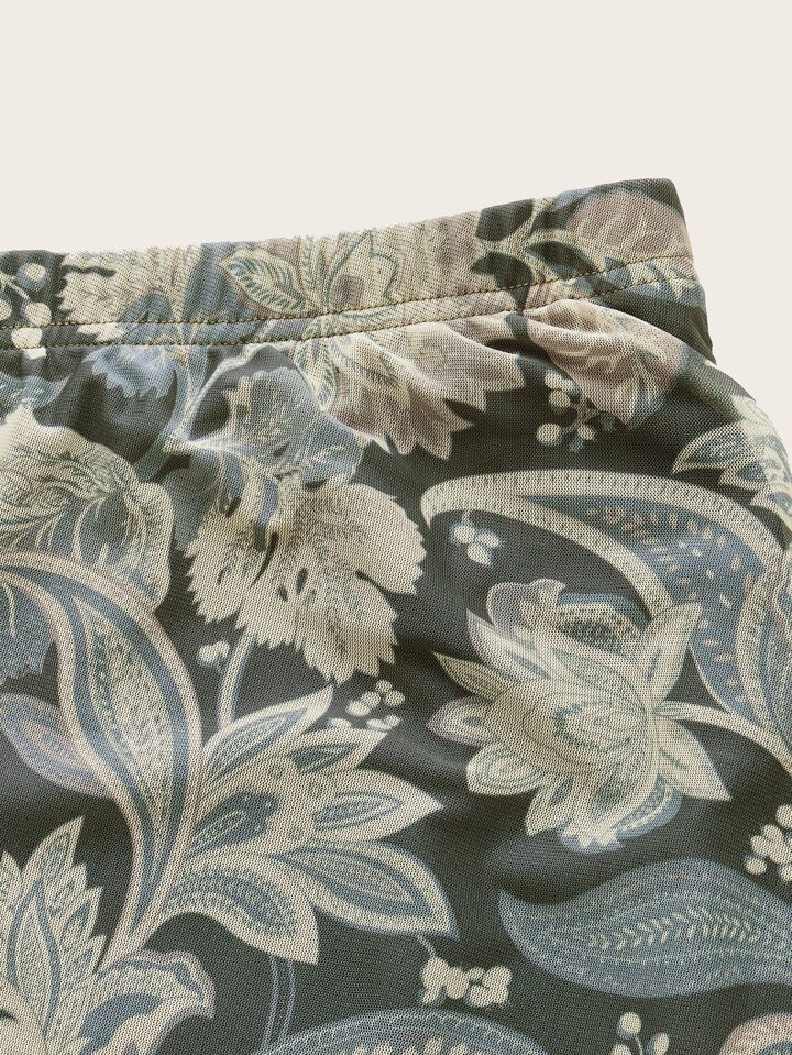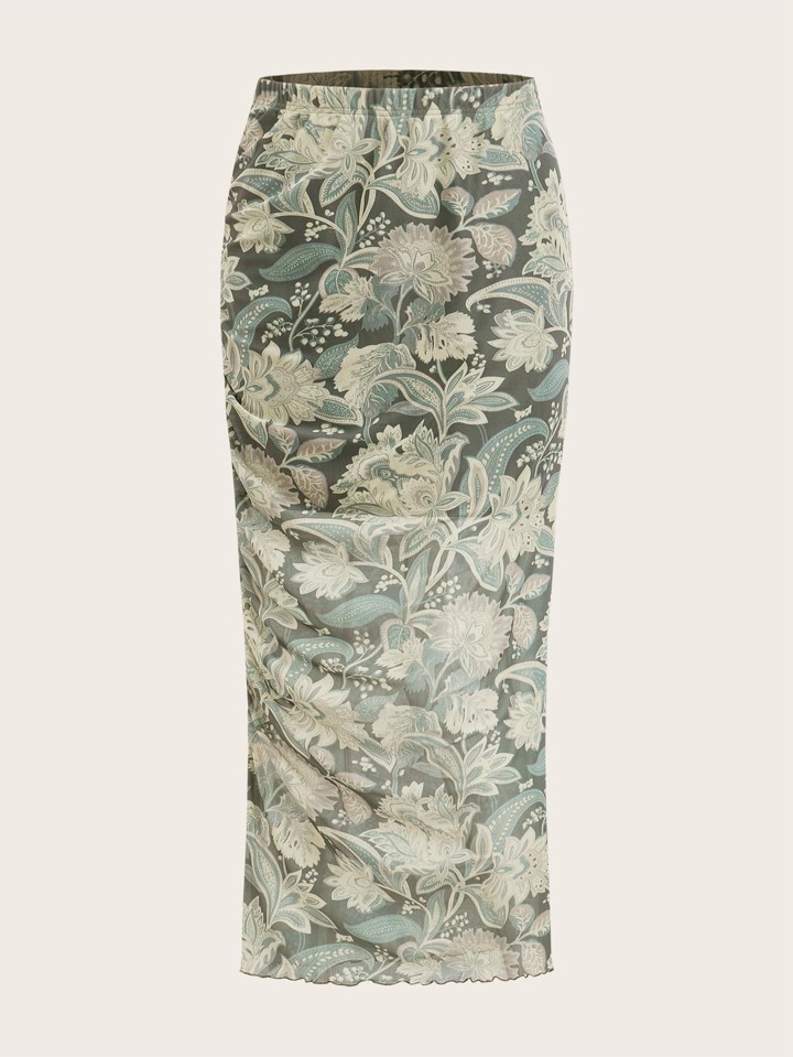 Floral Print Ruched Mesh Skirt