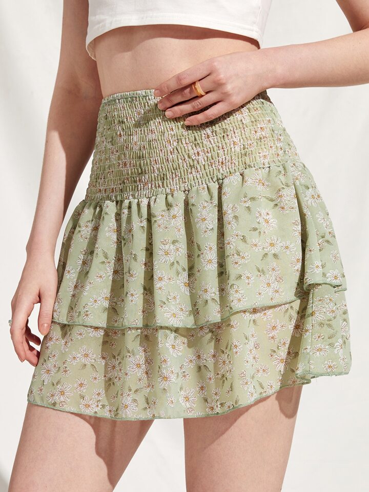 Floral Print Shirred Two Layered Hem Skirt
