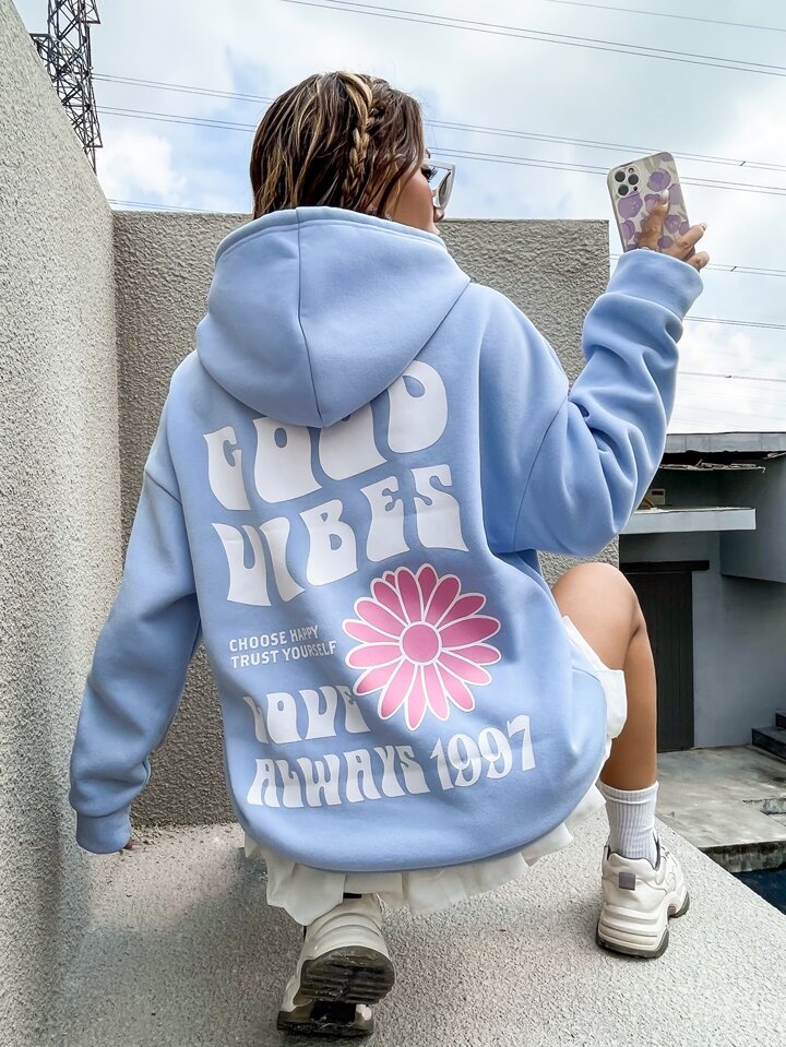 Floral & Slogan Graphic Drop Shoulder Drawstring Hoodie GOOD VIBES CHOOSE HAPPY TRUST YOURSELF LOVE ALWAYS 1997