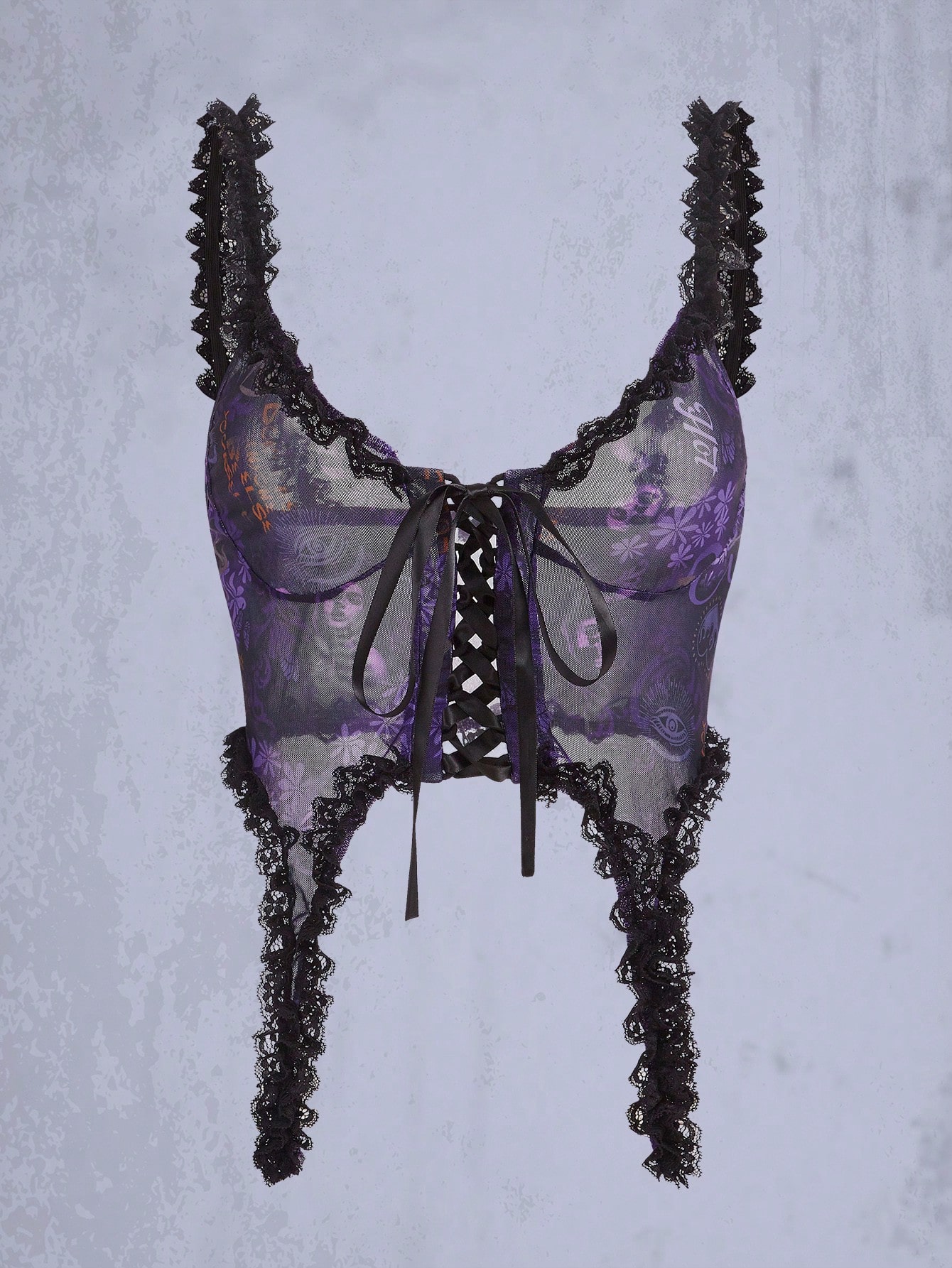 Floral and Figure Graphic Lace Up Front Lace Trim Sheer Mesh Cami Top