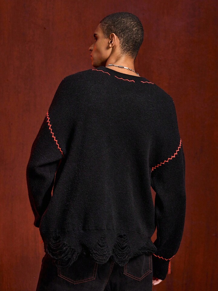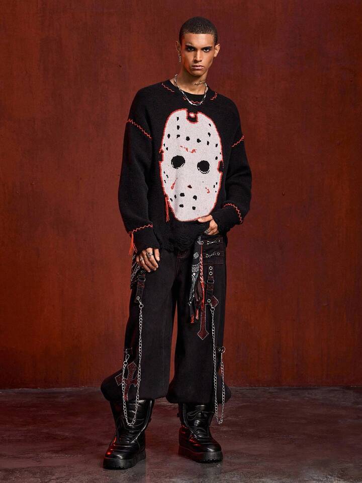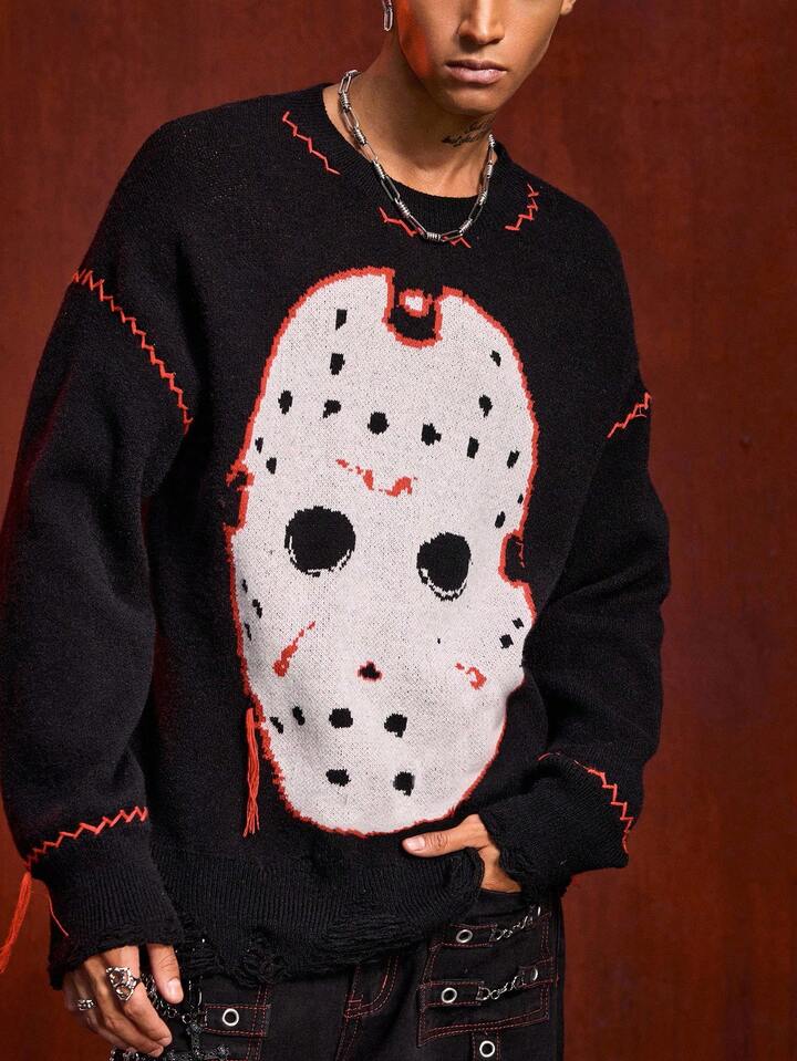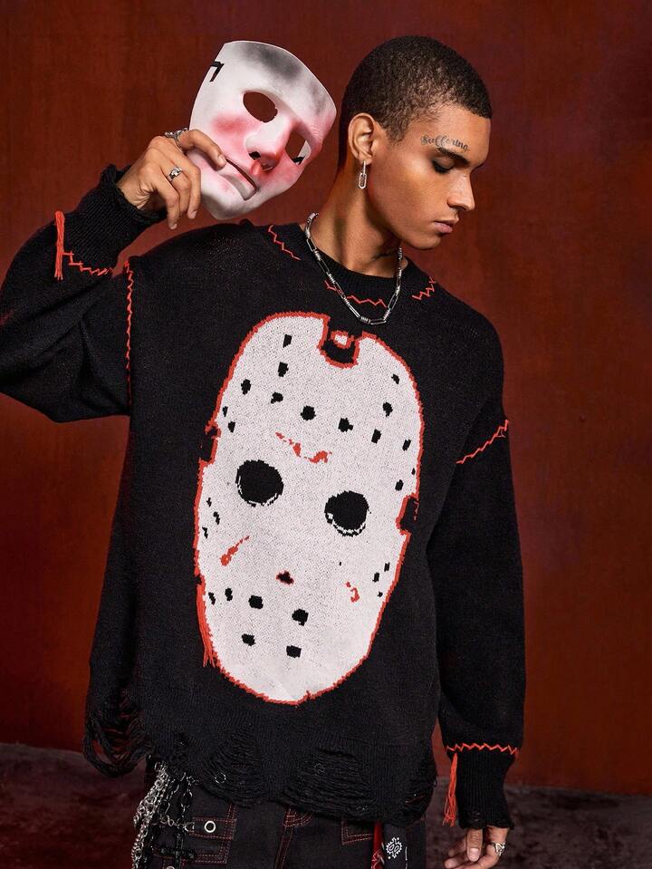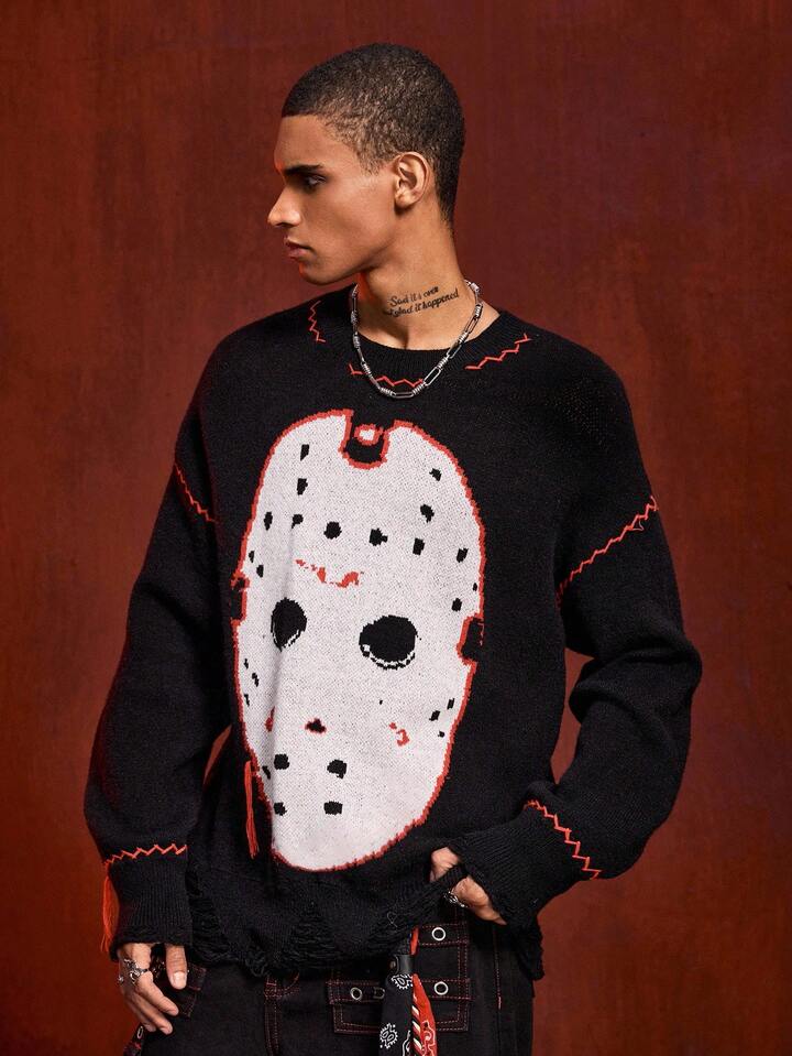 Friday the 13th X ROMWE Men's Mask Graphic Crew Neck Long Sleeve Pullover Sweater
