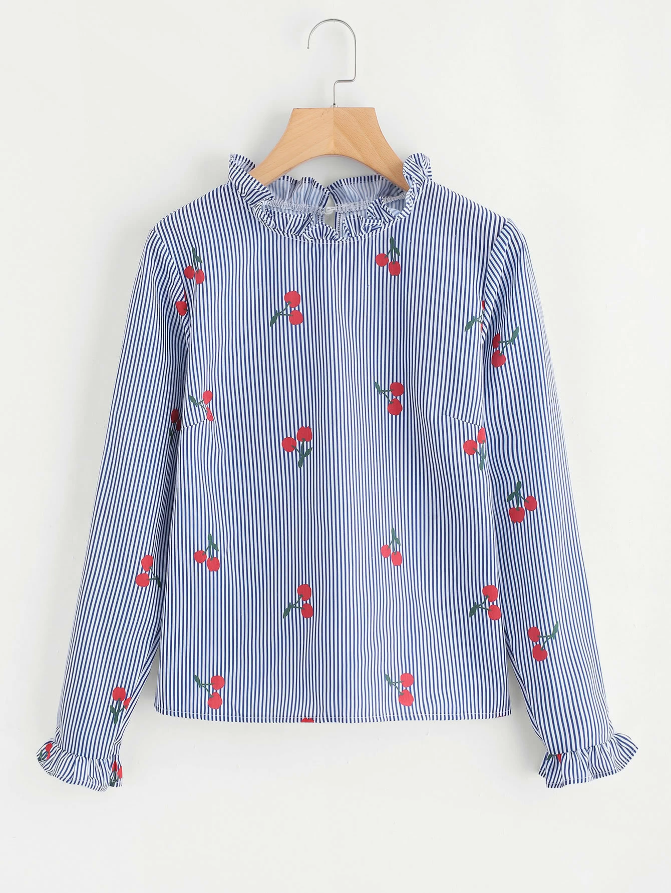Frill Trim Vertical Striped Cherry Print Blouse