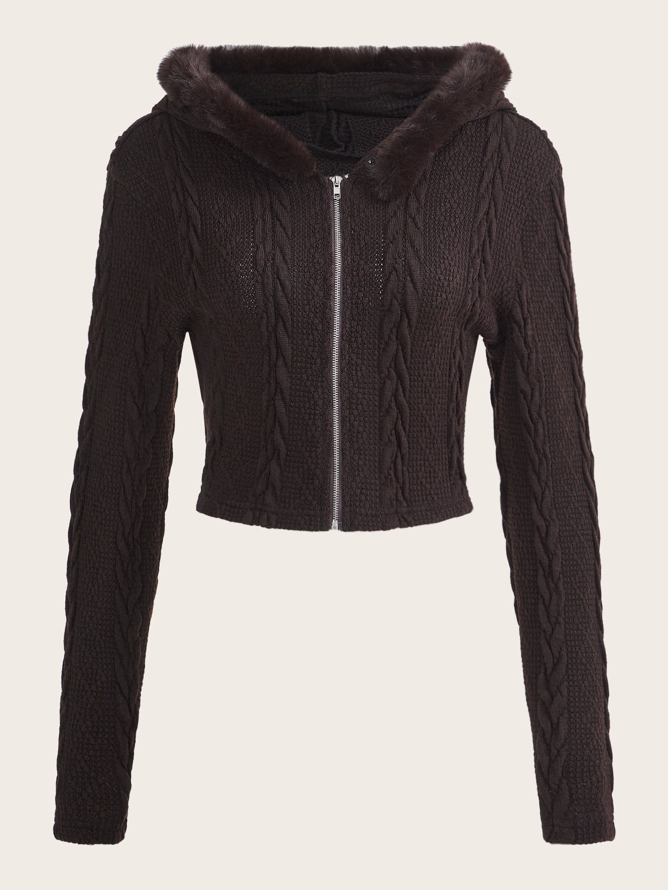 Fuzzy Trim Zip Up Hooded Cardigan