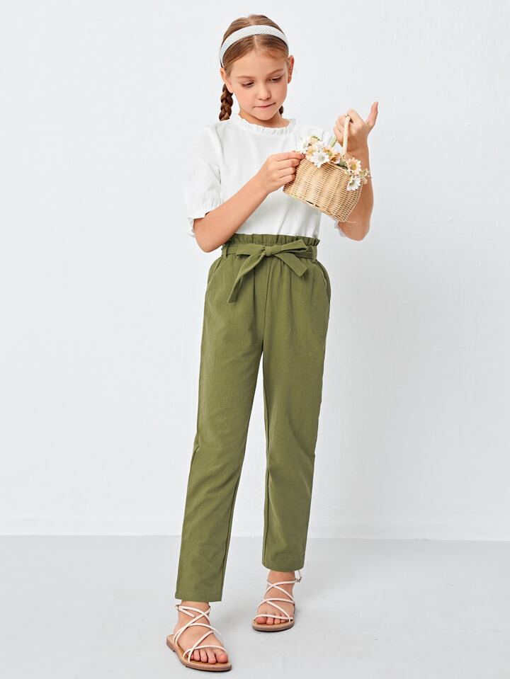 Girls Frill Mock Neck Ruffle Cuff Top & Paperbag Waist Belted Pants Set