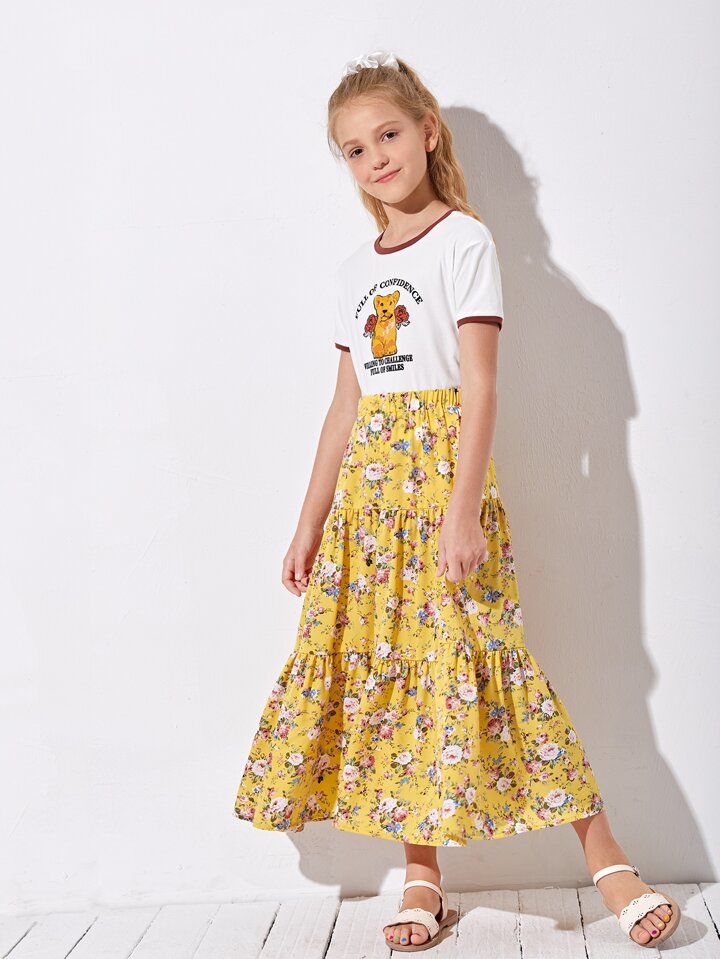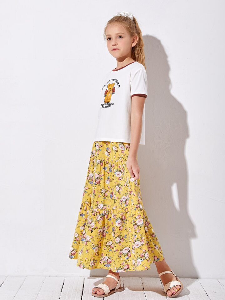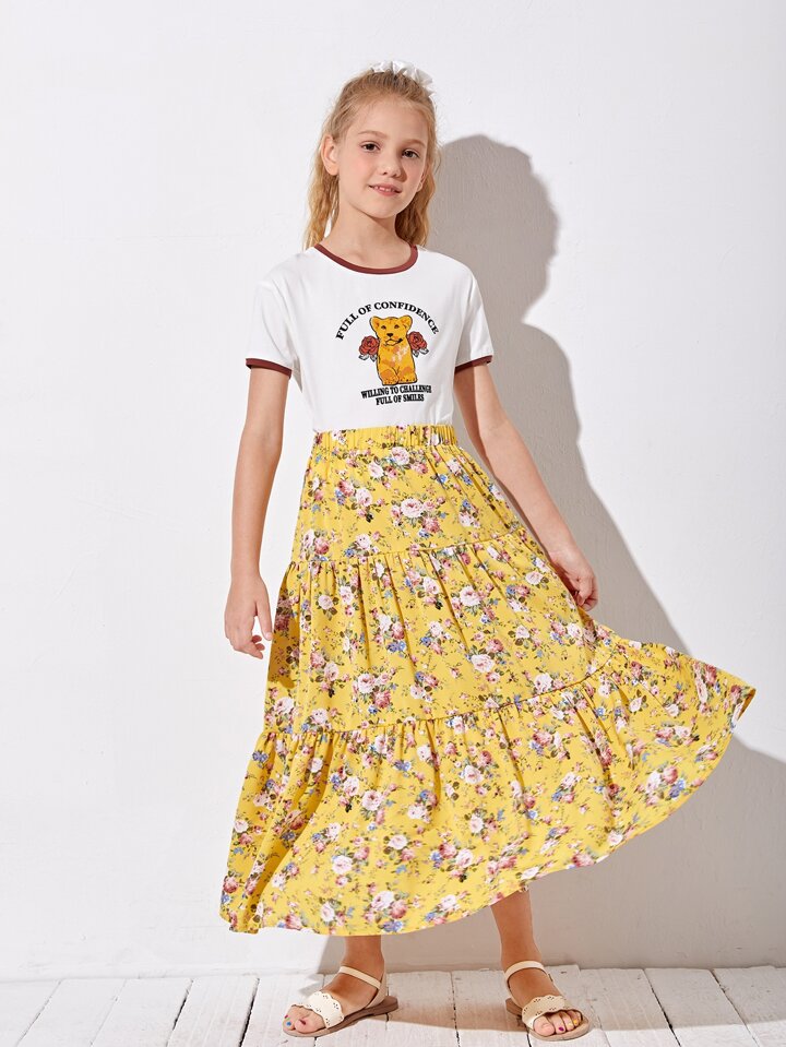 Girls Letter & Animal Print Ringer Tee and Skirt Set
