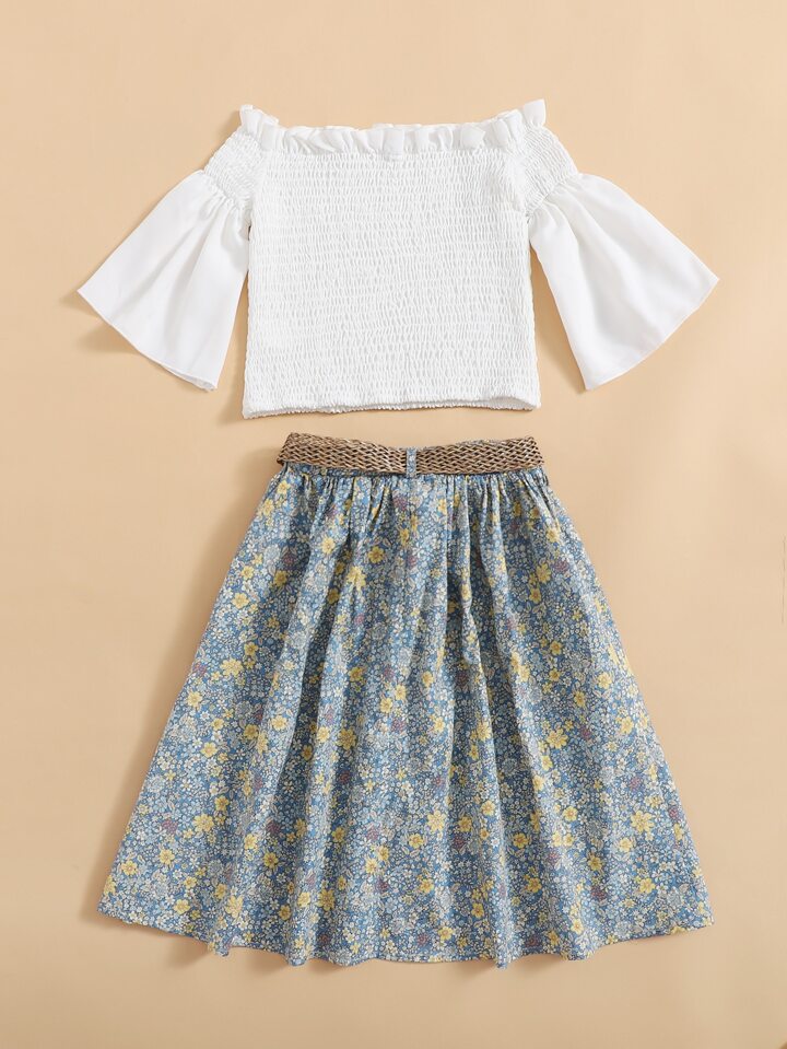 Girls Off Shoulder Shirred Top & O-ring Belted Ditsy Floral Skirt Set