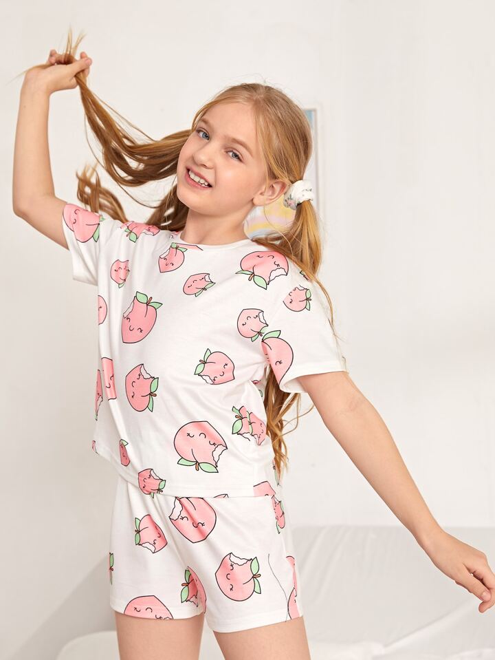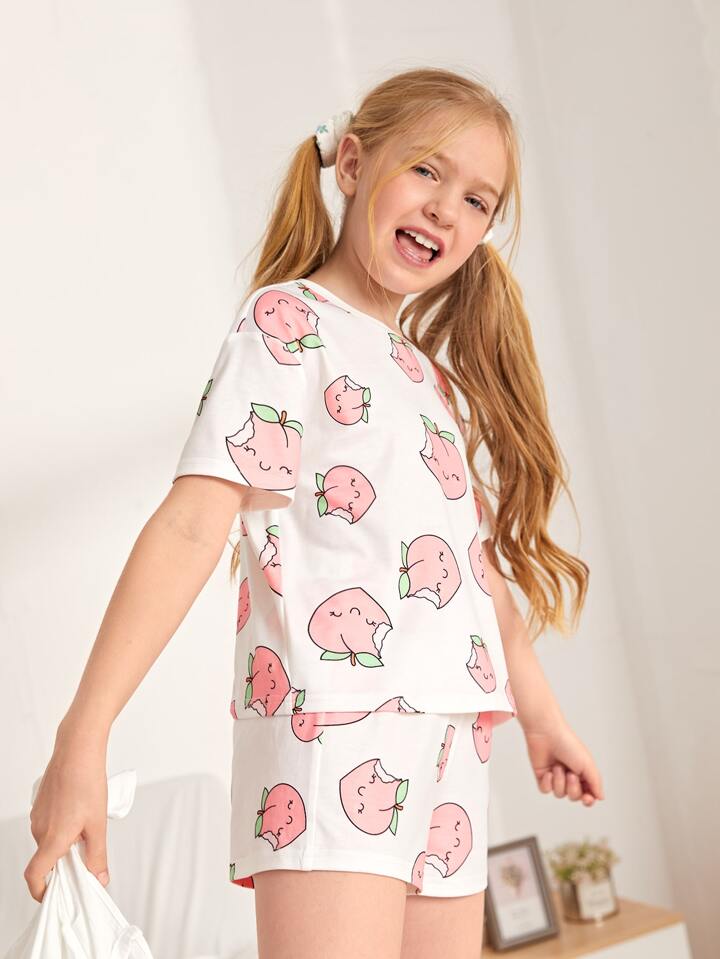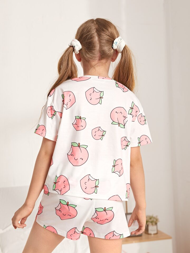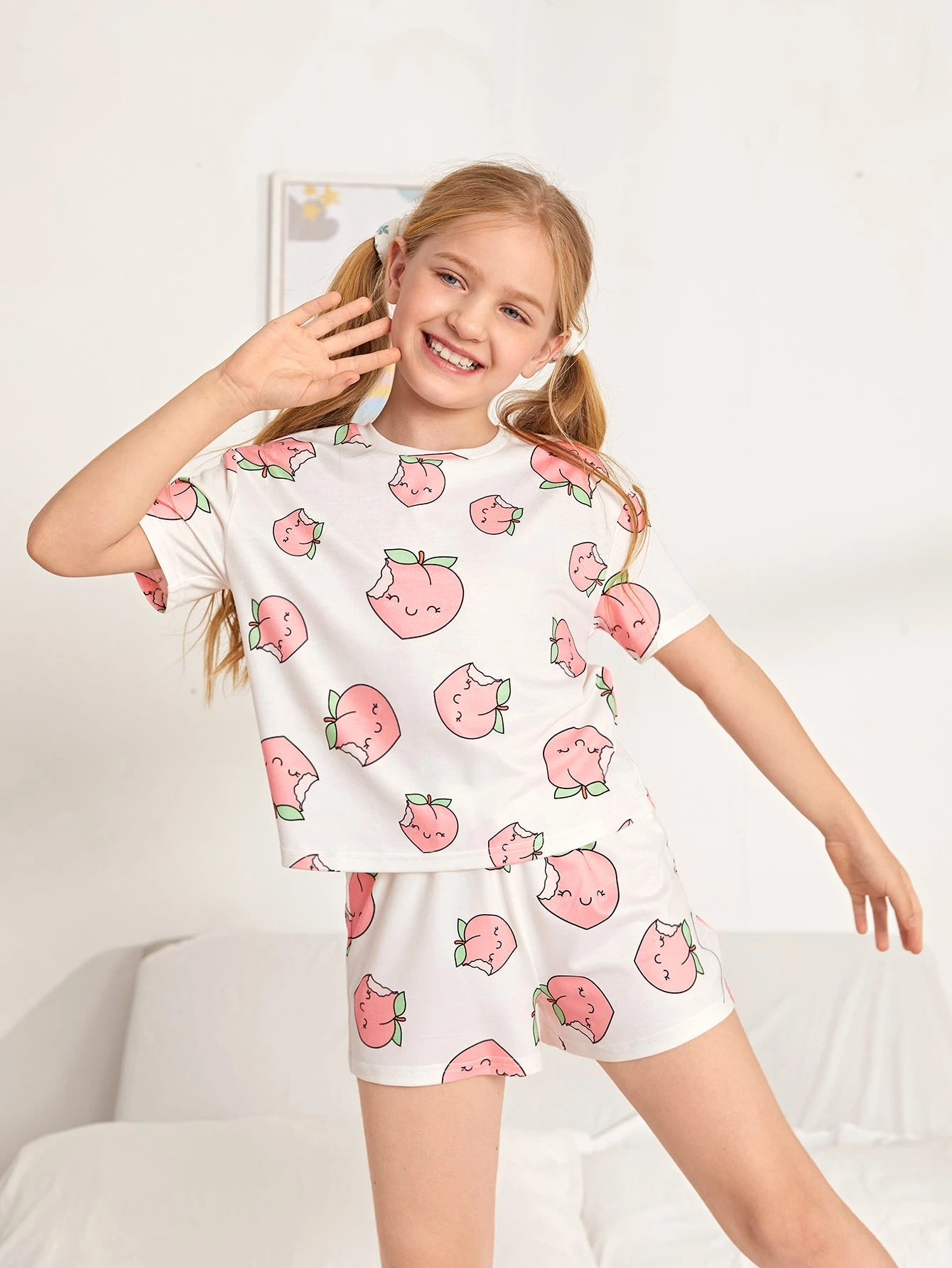 Girls Peach Cartoon Print Top & Shorts PJ Set