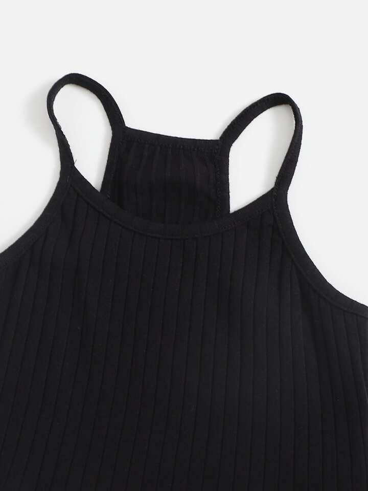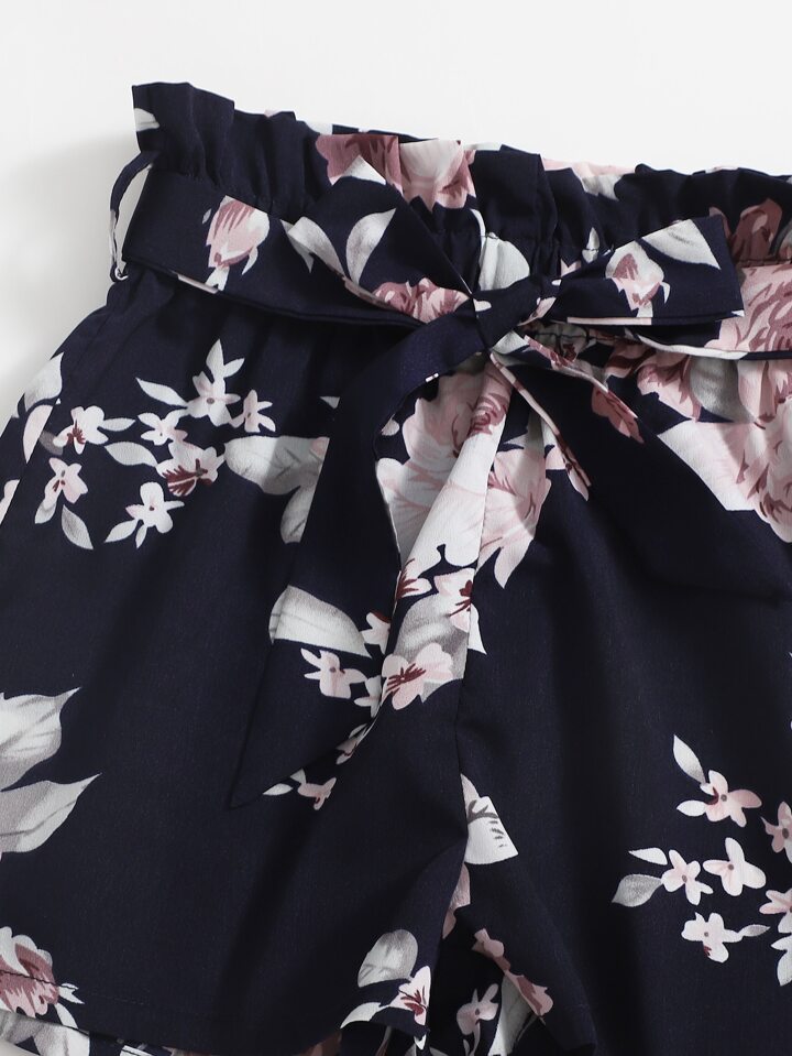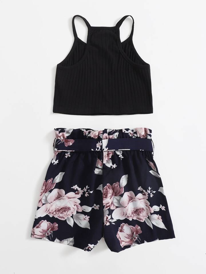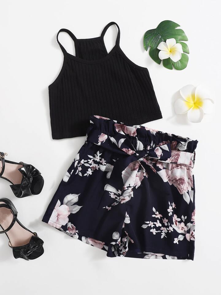 Girls Rib-knit Cami Top & Paperbag Waist Floral Shorts Set