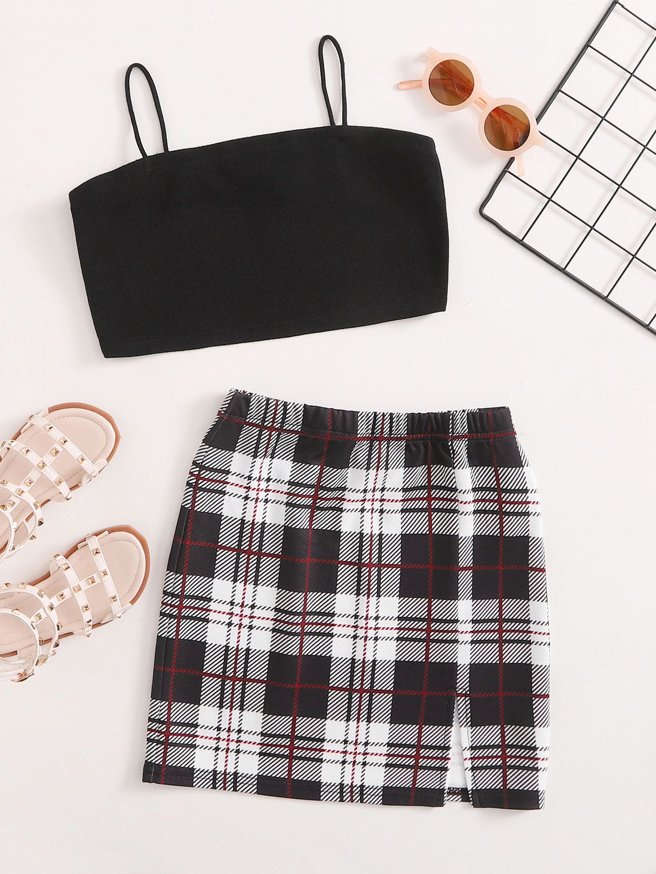 Girls Solid Cami Top & Split Hem Plaid Skirt Set