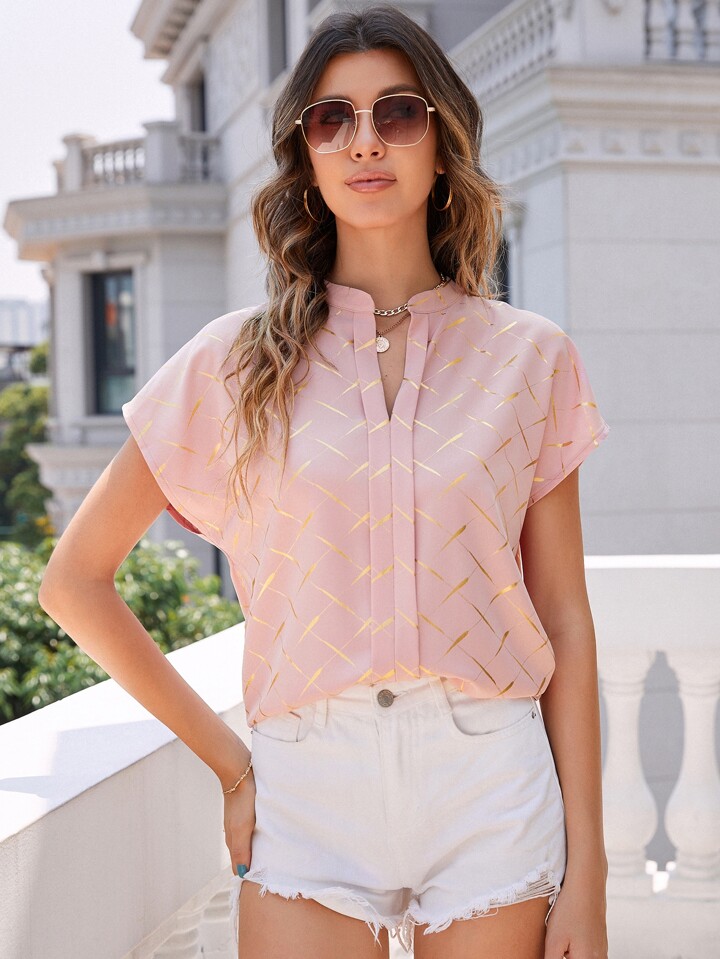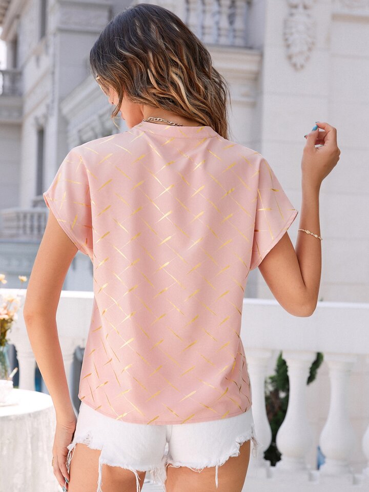 Gold Argyle Print Notched Neck Batwing Sleeve Blouse,Short Sleeve Tops