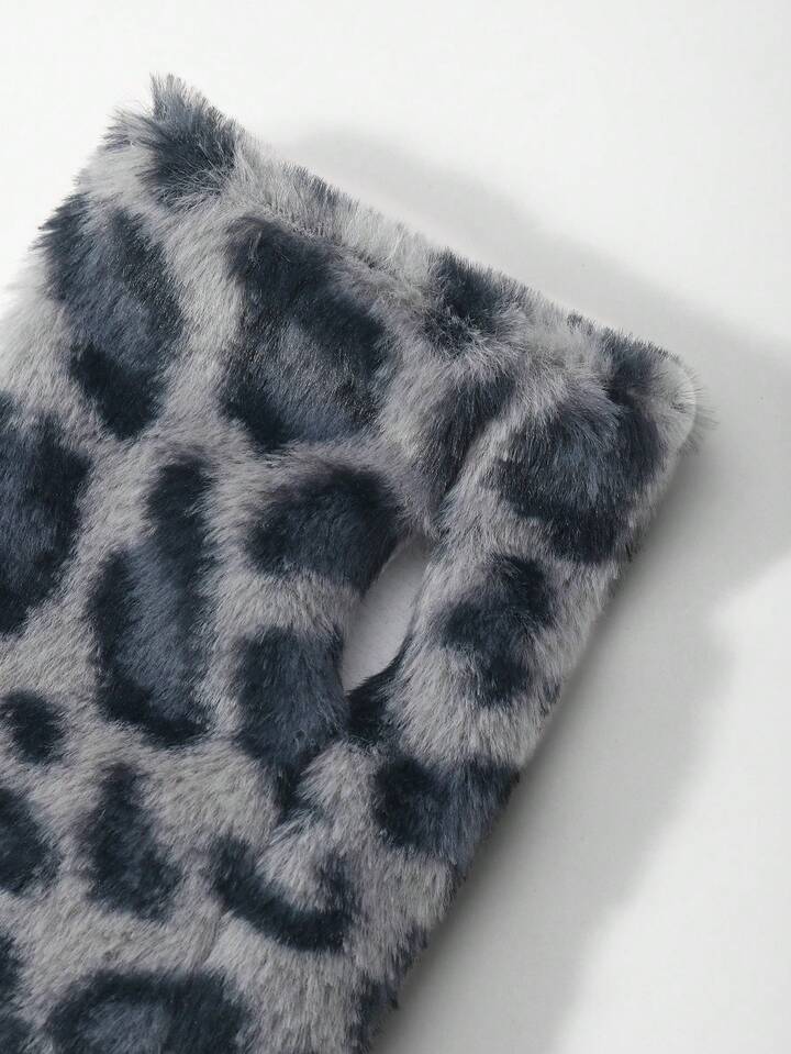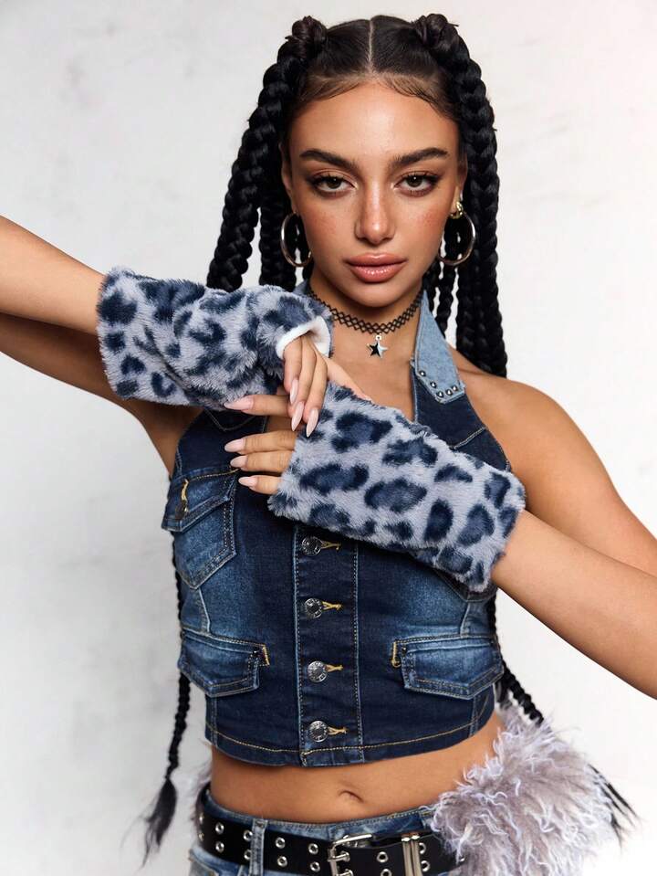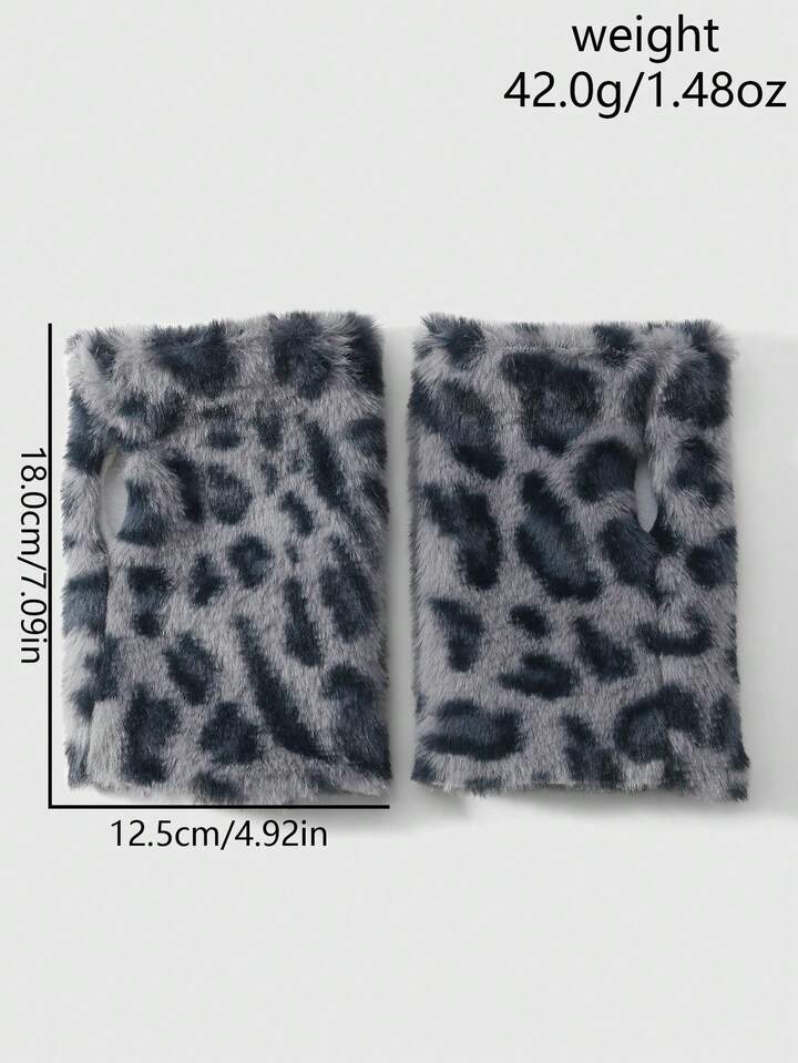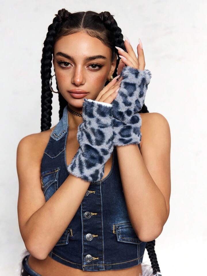 Goth 1 Pair Y2K Stylish Sweet Casual Cute High-Quality Plush Warm Blue Faux Rabbit Fur Leopard Tiger Animal Print Gloves With Long Sleeve Cuff, Fingerless Mittens Combo Set, Suitable For Women Daily Outfit, Holiday Gift
